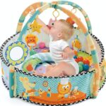​infant activity center with music, sounds, lights, and toys, including teether, clicker, and light-up “command center”