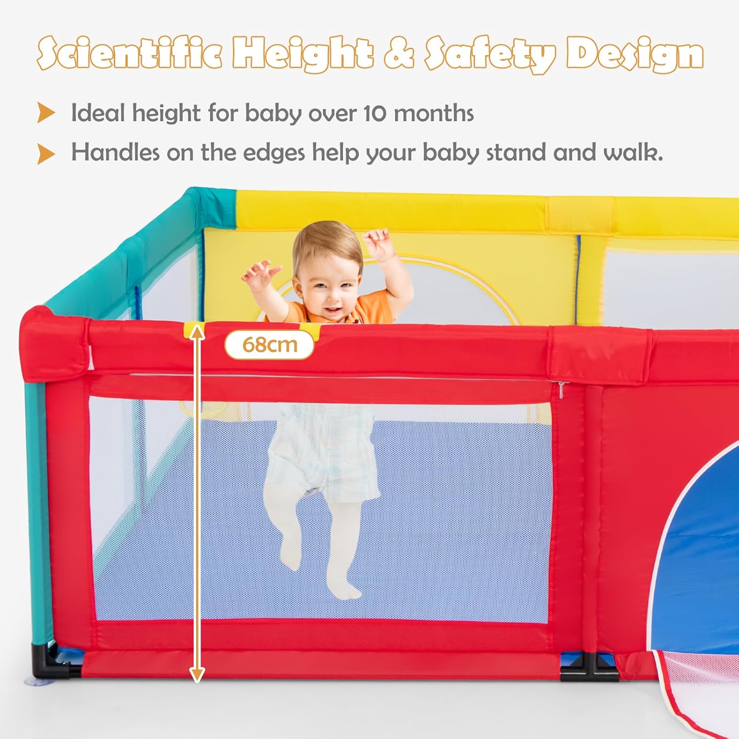 ✔ACTIVITY CENTER WITH SCIENTIFIC HEIGHT- This play center provides babies with a safe and comfortable playing environment. Attach the pull rings on the frame to help children learn to stand up, making them more independent and grow better. Besides, 68cm proper height prevents baby from leaving the area, ideal for babies over 10-month.