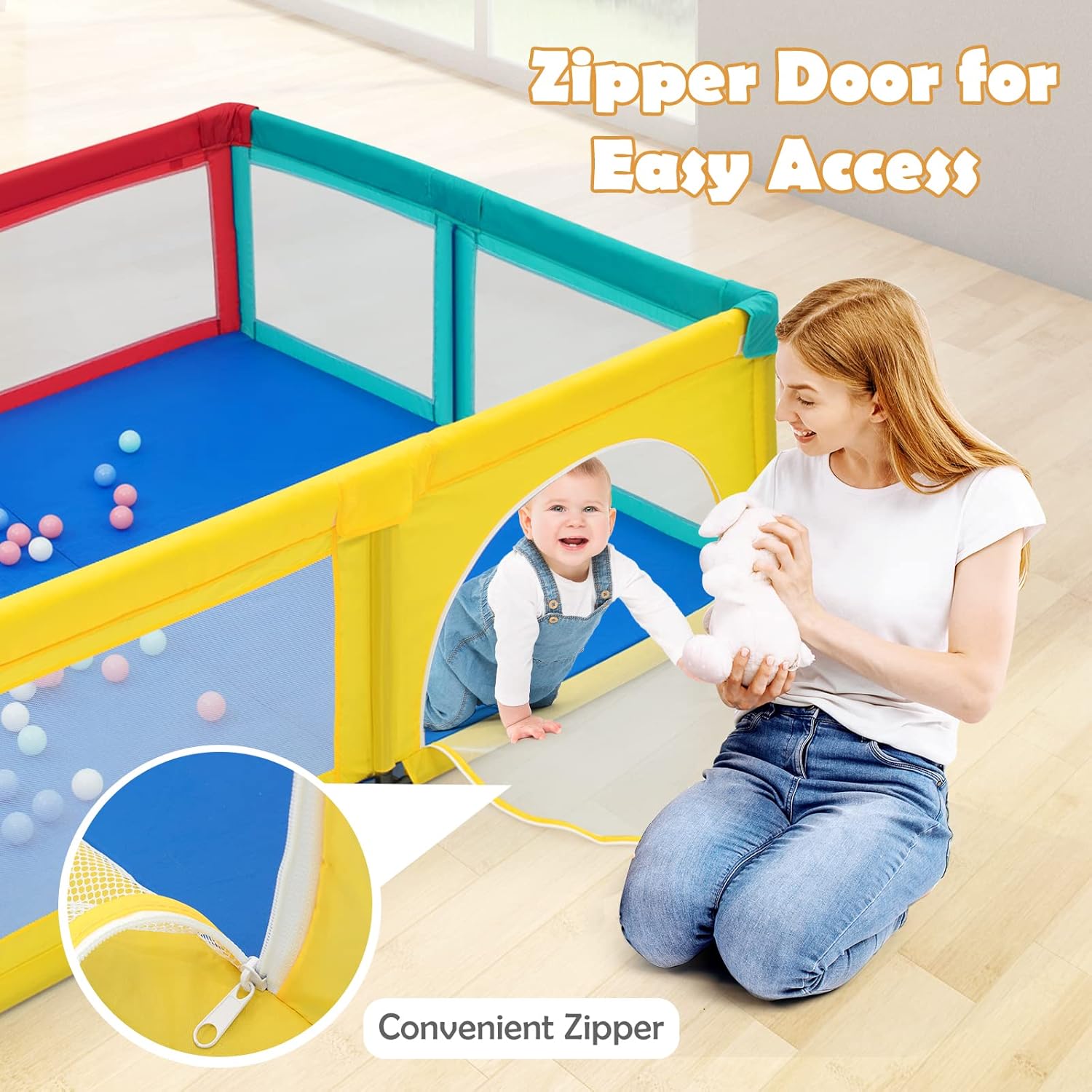 ✔ZIPPED DOOR & MESH WALLS- The 4 sides of our playpen are made of soft, breathable and visible mesh, so that babies and parents can see each other clearly. What’s more, two round doors allow baby get in and out easily. At the same time, the external zipper design can effectively prevent babies from climbing out the toddler fence when you are busy.