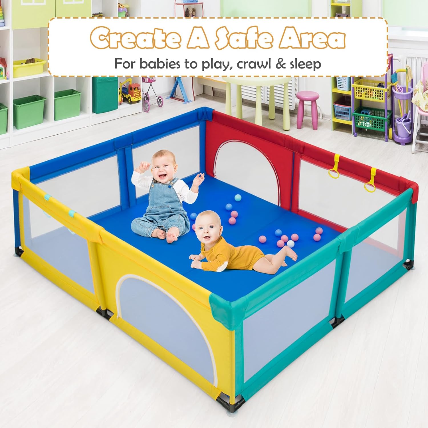 ✔LARGE PLAYPEN AREA & ACCESSORIES- Measuring 206 x 186cm in length and width, this extra large baby playpen provides plenty of room for the children to play with their toys friends or pets. It can also accommodate parents to accompany babies to play together. Moreover, the product goes with 50 ocean balls, 4 handlers, your little baby will love the new playing yard.