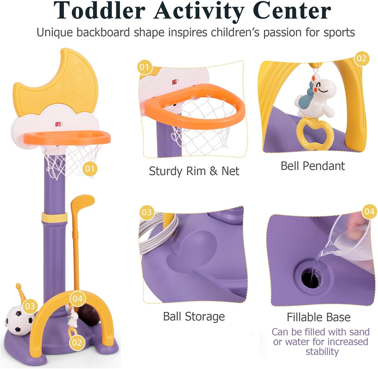 4-in-1 Design: With the soccer goal, basketball hoop, golf and ring toss, this kids basketball stand provide a interesting activity center for your litter one. Meanwhile, the lovely bell pendant and cute appearance are very popular with kids.