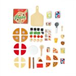 53-piece set includes play food (pizza slices, sauce, cheese, mushrooms, peppers, olives, pepperoni, cheese/pepper shaker, ice cream scoops and cone), drink cans, wooden pizza paddle, logs for oven, wooden pizza cutter, ice cream cup and spoon, 8 wooden menu magnets, pizza toppings storage tray, play bank card, and card machine, cardboard pizza box