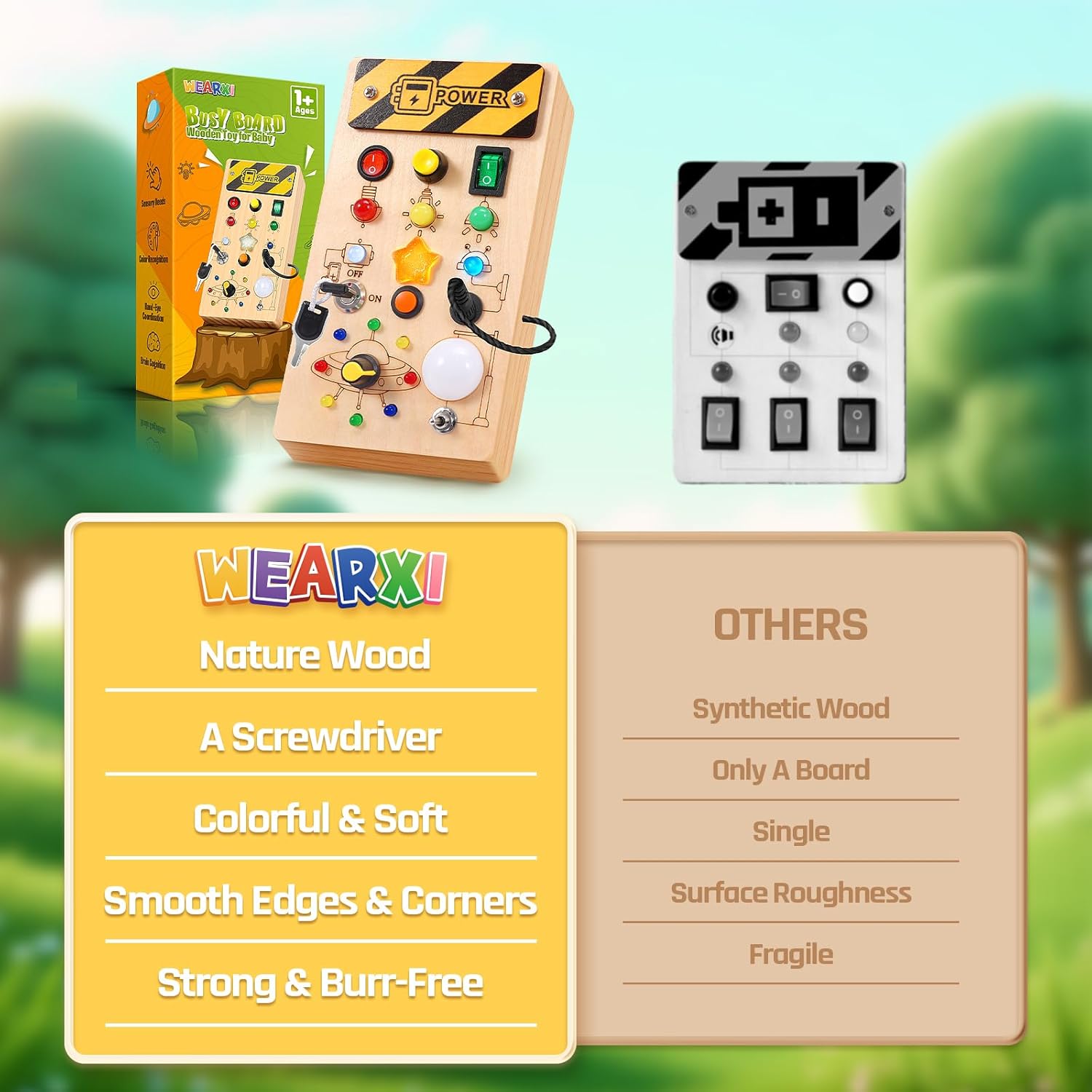 [ Perfect Toddler Toys for 1-3 Year Old ] – WEARXI LED Wooden Busy Board is a Montessori Toys specially designed for 1-3 Year Old. It comes with 8 styles of switches and 15 LED bulbs, and each switch activates a different color of LED, providing soft and eye-friendly lighting. These lights are vivid yet gentle on young eyes. The sensory board with diversifying switches and lights fascinates toddlers. It is a perfect baby toy & kids toy. It needs 2 AAA Batteries, but the battery is not included
