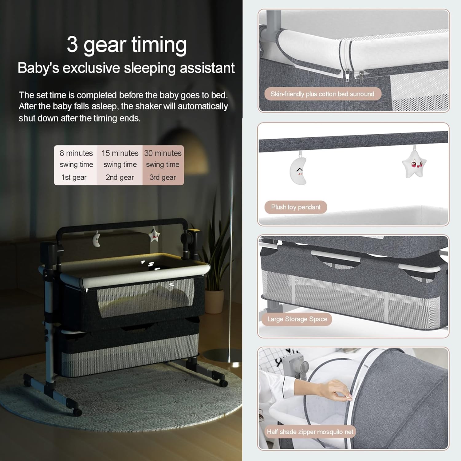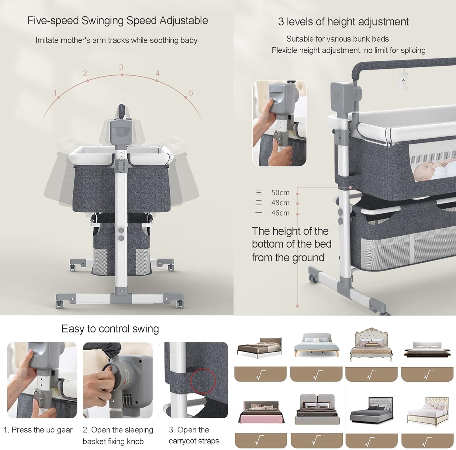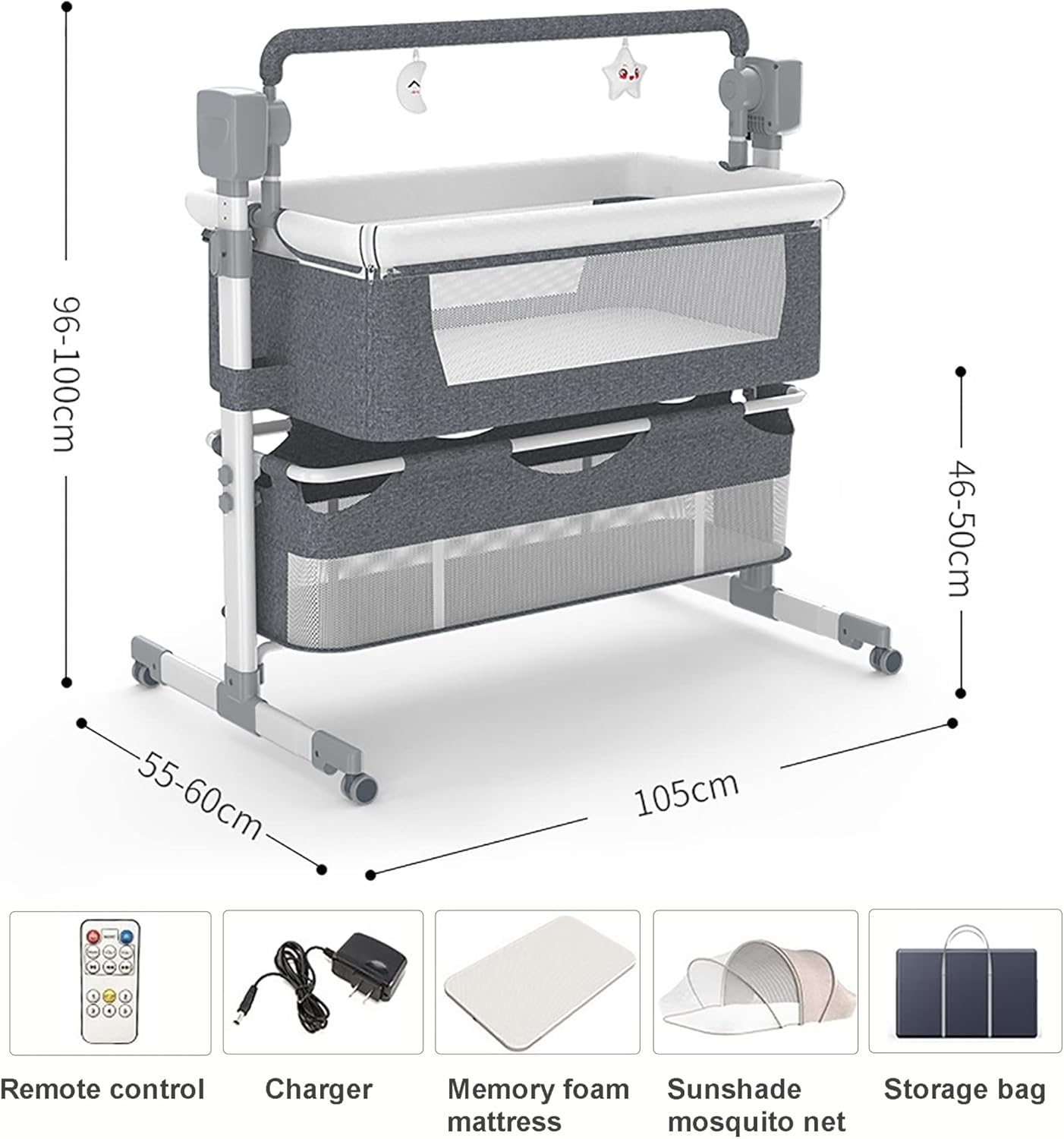Safety is paramount with a fixed belt design to prevent side turning, anti-skid foot pads for increased stability, and simple installation for peace of mind. Suitable for ages 0-24 months, this baby bed comes in a variety of colors to suit any nursery decor. The package includes a portable baby swing, remote control, charger, memory foam mattress, sunshade mosquito net, and storage bag.