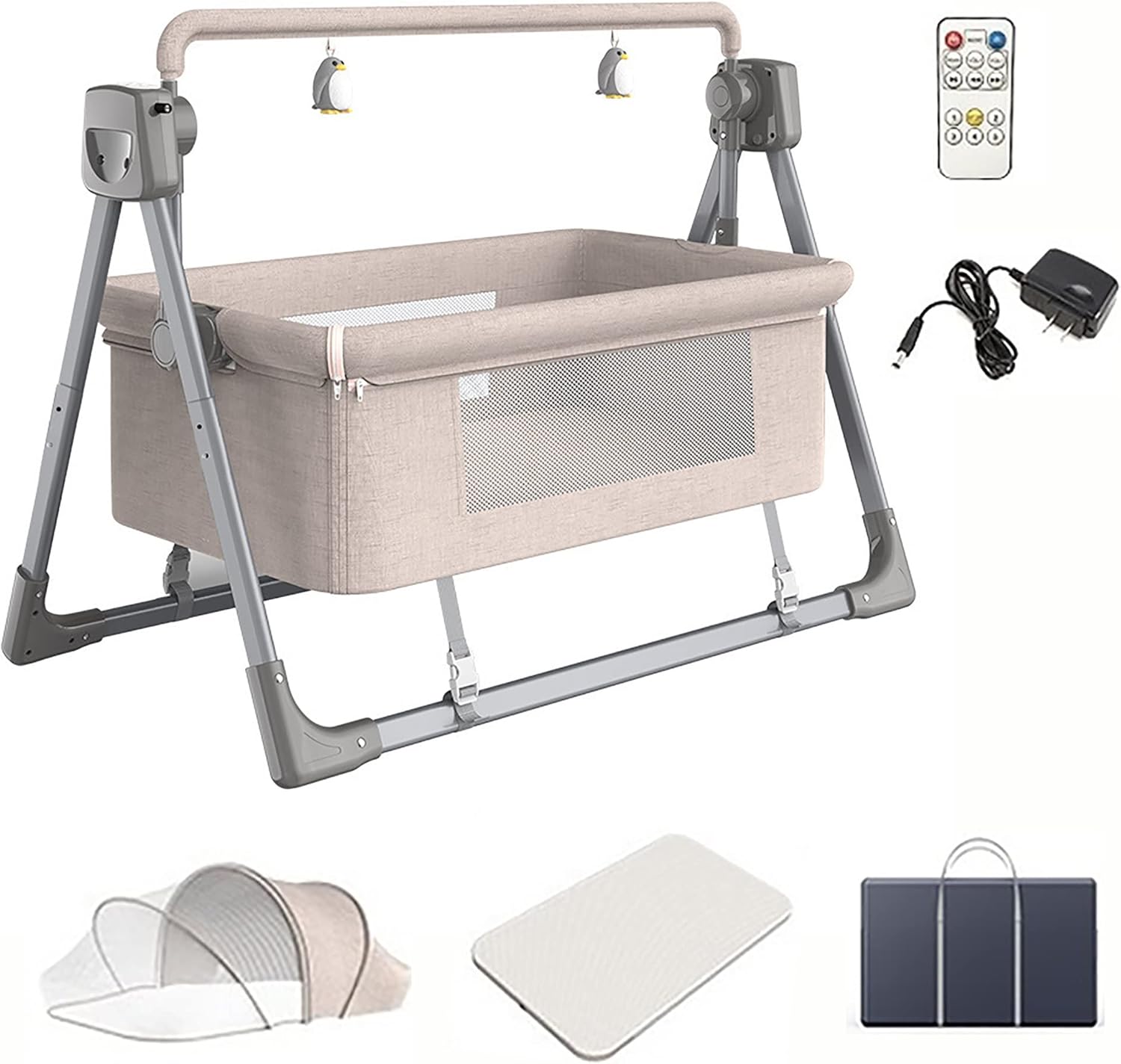 The tasteful fashion is sure to compliment the decor of any home and is perfect for a girl or boy. Function: Automatic Rocking Chair,5 gears swing speed Can Be Adjusted,3 gear swing timing (15min, 30min, 45min) Remote Control, Intelligent Control. The Timer Function, Automatic Shutdown,Do Not Run for a Long Time, Energy Conservation and Environmental Protection. Safety Fixed Belt Design to Prevent Side Turning. Anti-skid Foot Pads Increase Friction with the Ground,It’s Hard to Move and Tip When Shaking. Product name: Baby bed Product color: khaki Product style: electric cradle Product material: aluminum alloy/polyester fiber, etc. Applicable age: 0-36 months (depending on personal situation) 【Package including】 1 Portable Baby Swing 1 Remote control 1 Charger 1 Memory foam mattress 1 Sunshade mosquito net 1 Storage bag 【Please note】 About the smell: Any new baby swing will have some smell. Brand new materials, fabrics, plastics, wheels, etc, plus sealed in the box, there will be some smell in the box. Once the cart is assembled, place it in a ventilated place and use it. About color difference: This product is taken in kind, but due to different lighting conditions, different displays and personal reasons, the actual object may have some color deviation from the photo, and the final color is subject to the actual object. About size: Before buying a stroller, please refer to the baby details and size chart. The product is measured by hand and there will be some errors. The actual size is subject to the actual product.