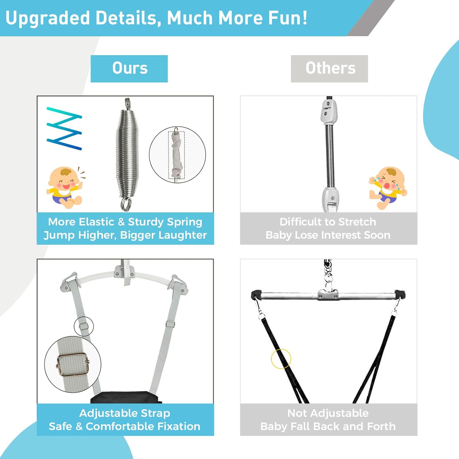 【More Flexible Springs & Height Adjustable Strap】FUNLIO baby doorway jumpers feature high-quality 304 stainless steel springs, strong & flexible. Our springs offer an extended and dynamic stretching range. Your baby can jump higher and have more fun! The nylon rope is equipped with an extensive adjustable height range, granting you the freedom to set the jumper at the perfect height. Baby will enjoy a comfortable and enjoyable playtime.