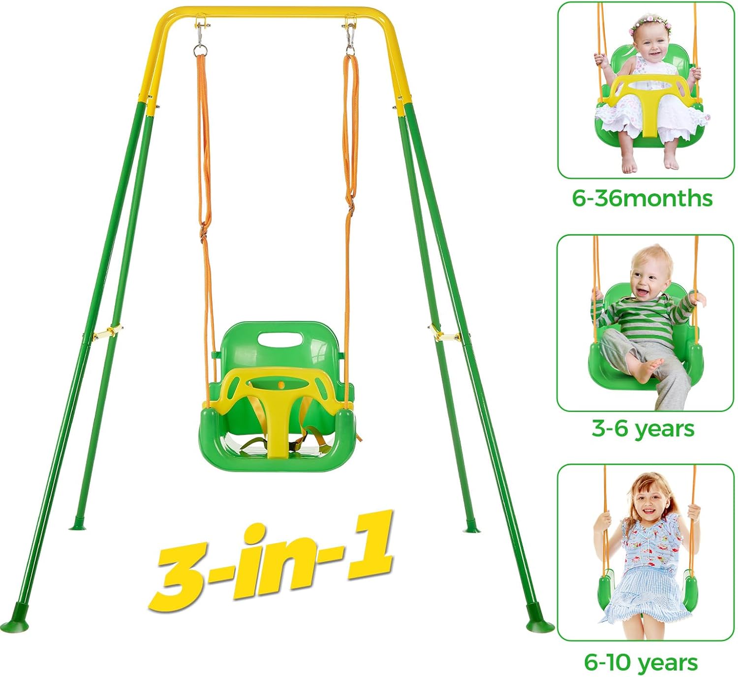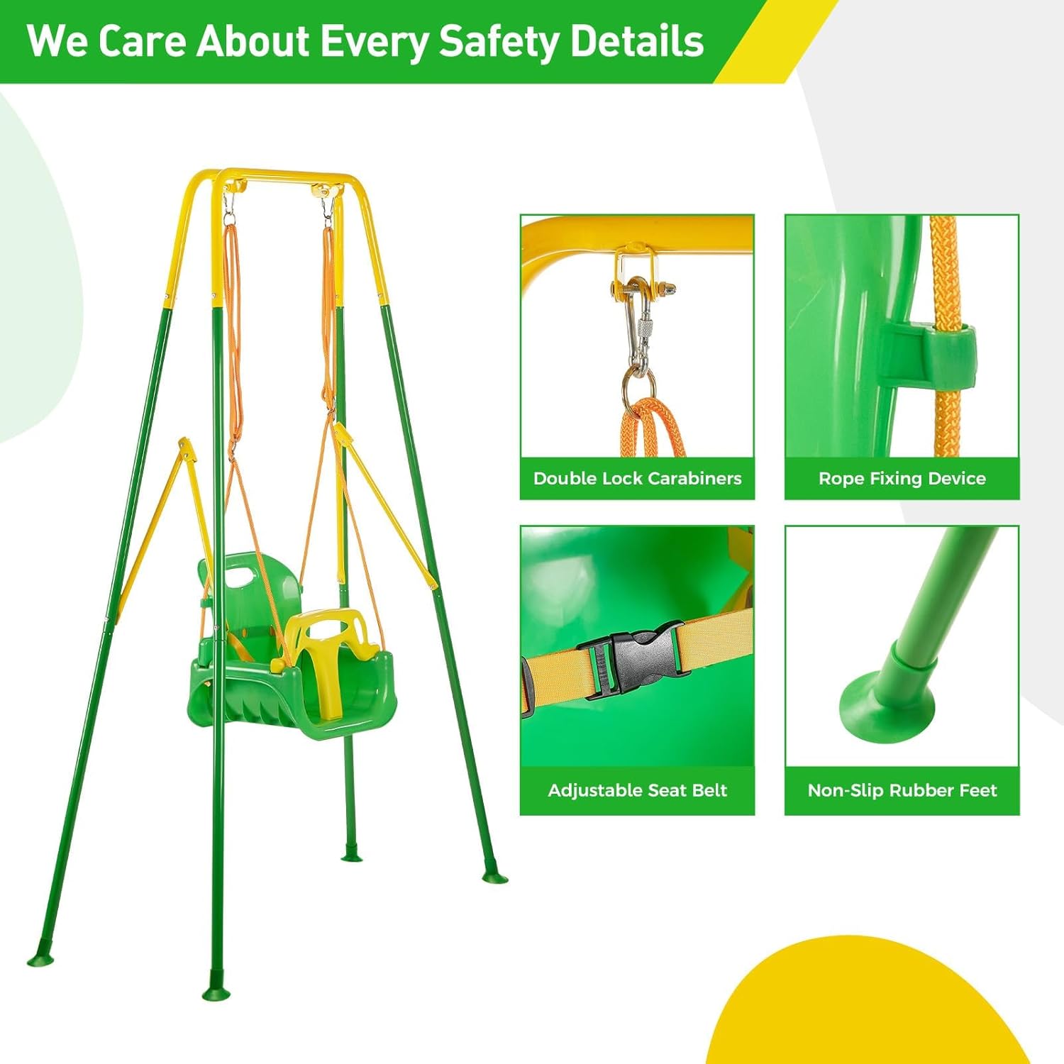 【Easy to Assemble, Foldable & Convenient to Store】Our indoor/outdoor baby swing set comes with clear and detailed instructions, 10 minutes is enough. You can assemble it with your lovely kids, spend happy family time, and exercise kids’ hands-on ability. The metal stand can be folded, making it easy to store.