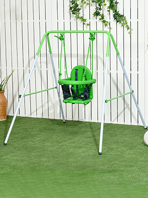 Steel frame: Powder coated for extra strength, it’s designed as an ‘A’ shape for balance and stability. It includes four non-slip pads, preventing this baby outdoor swing from tipping over.