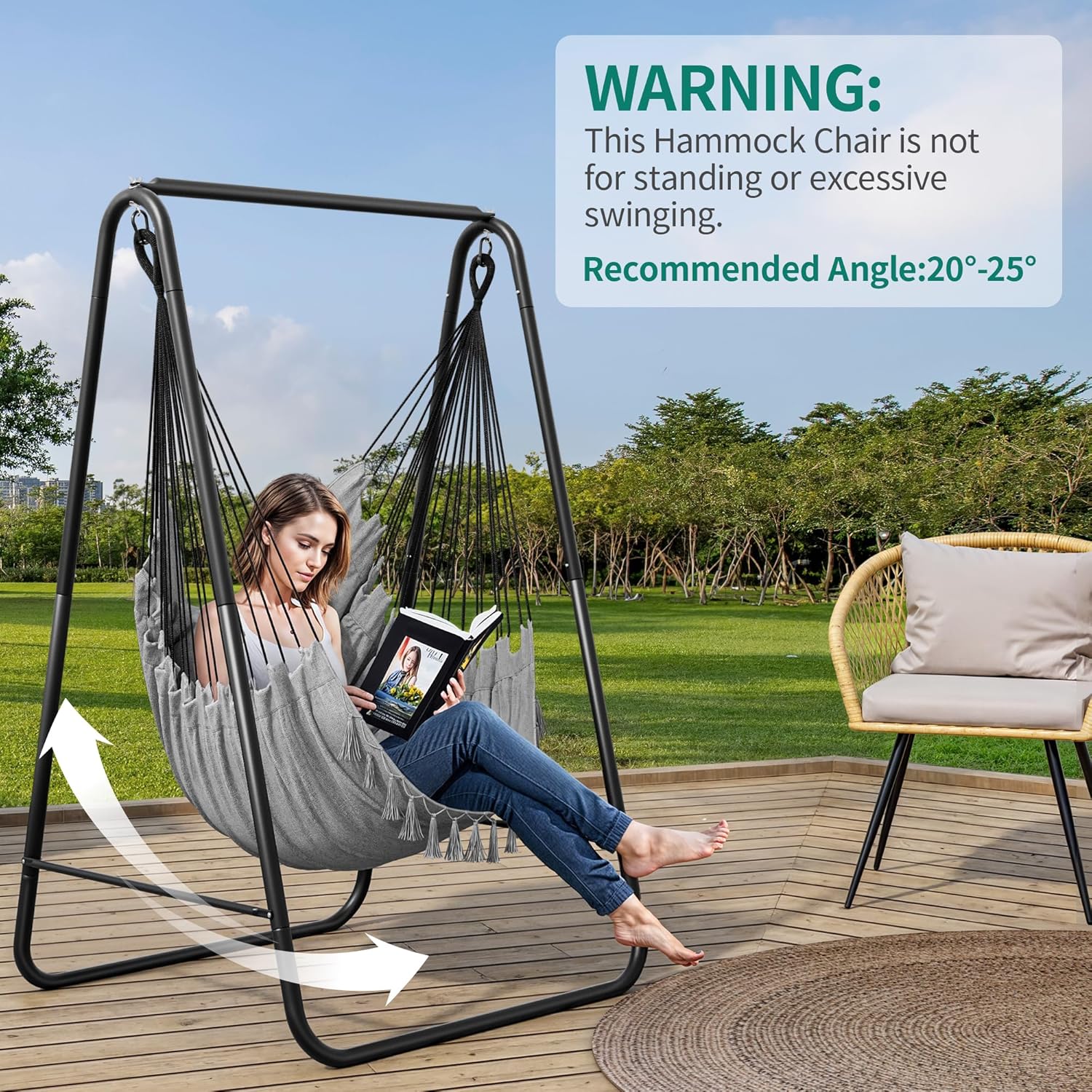 UPGRADED DESIGN- Our swing chair has a unique design on the side, an extra cloth bag to help you store books and magazines, etc., bringing convenience to your leisure time