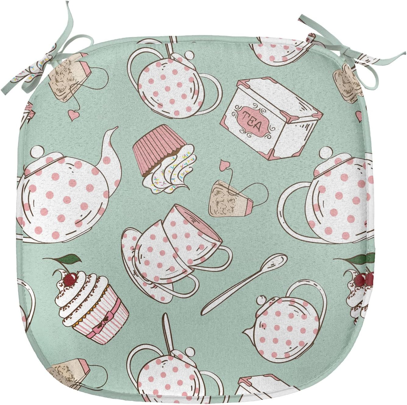 Ambesonne Tea Party Chair Seating Cushion Set of 12, Polka Dots on Teapots and Cups Cupcake with Cherry on Top Teabag English, Anti-Slip Seat Padding for Kitchen & Patio, 16″x16″, Almond Green Coral