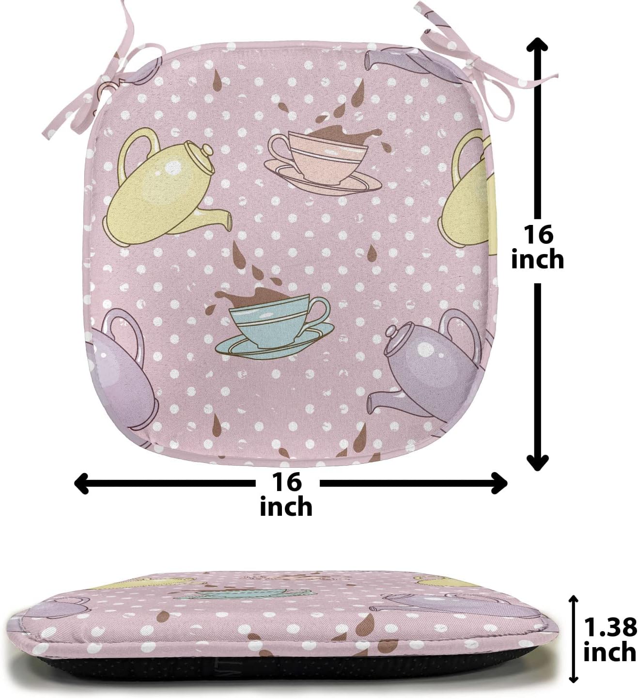 Ambesonne Tea Party Chair Seating Cushion Set of 8, Polka Dots Background with Teapots Teacups Retro Cartoon Style, Anti-Slip Seat Padding for Kitchen & Patio, 16″x16″, Pale Green Turquoise