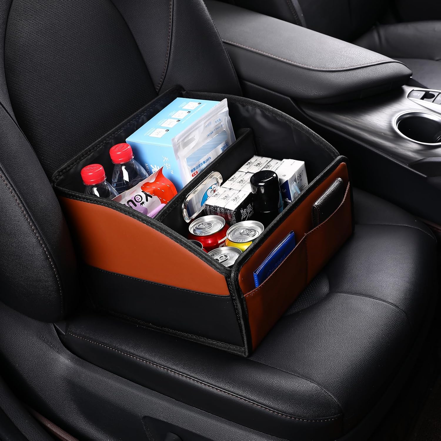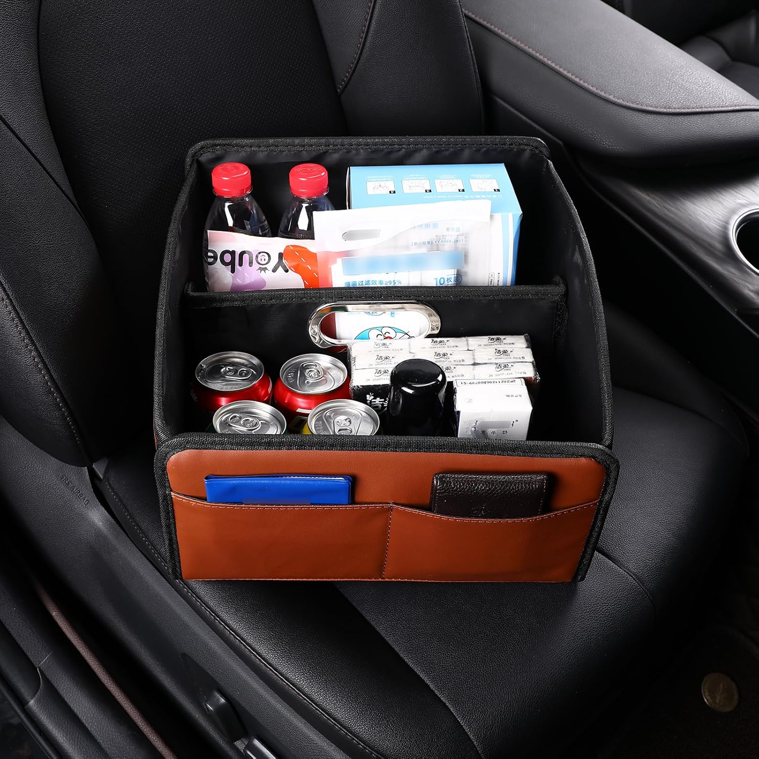 Car Front-Back Passenger Seat Organizer Box with Metal Handle – Portable Multi-Pocket Storage Caddy and Divided Holder for Travel Essentials, Leather Foldable Universal Floor Basket Kids