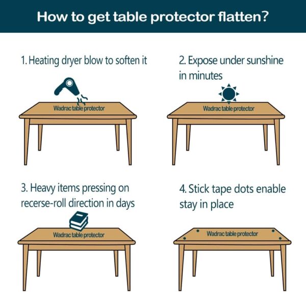 Warm Tips:How to make Vinyl Tablecloth Flat?1. Use hair dryer heating it after lay; 2. Lay out the PVC table protector in Reverse-Roll direction, use heavy duty items pressing on it in days; 3. Steep in hot water or expose under sunshine in minutes;or stick double-sided tape dots between table and the vinyl table protector,Heat Resistant transparent table cloths,(maximum to 81 Centigrade, or 176 Fahrenheit),Water Resistant furniture table topper protector,easy clean table runner