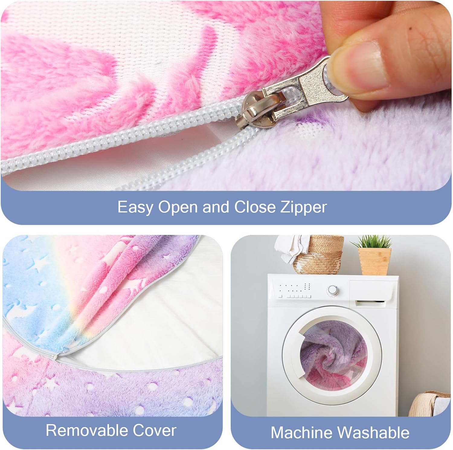 Unicorn Bean Bag Chairs for kids: This toddler bean bag bed with glowing unicorn pattern. Expose the fluffy bean bag chair to sunlight or light during the day, the small bean bag with a soft glow adds a touch of wonder to any kids’ room at night. The glow of the kid’s bean bag chair is soft and will not affect sleep, it is very suitable for the bedroom and bedside, making the bedroom very beautiful and elegant