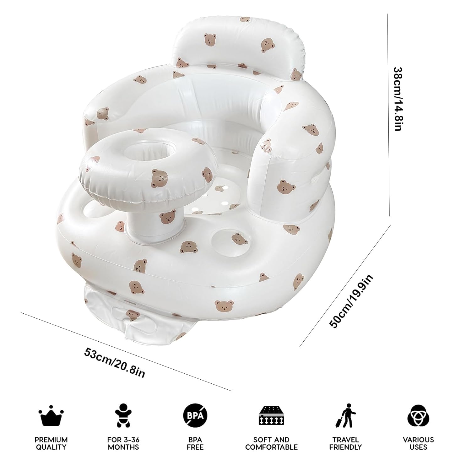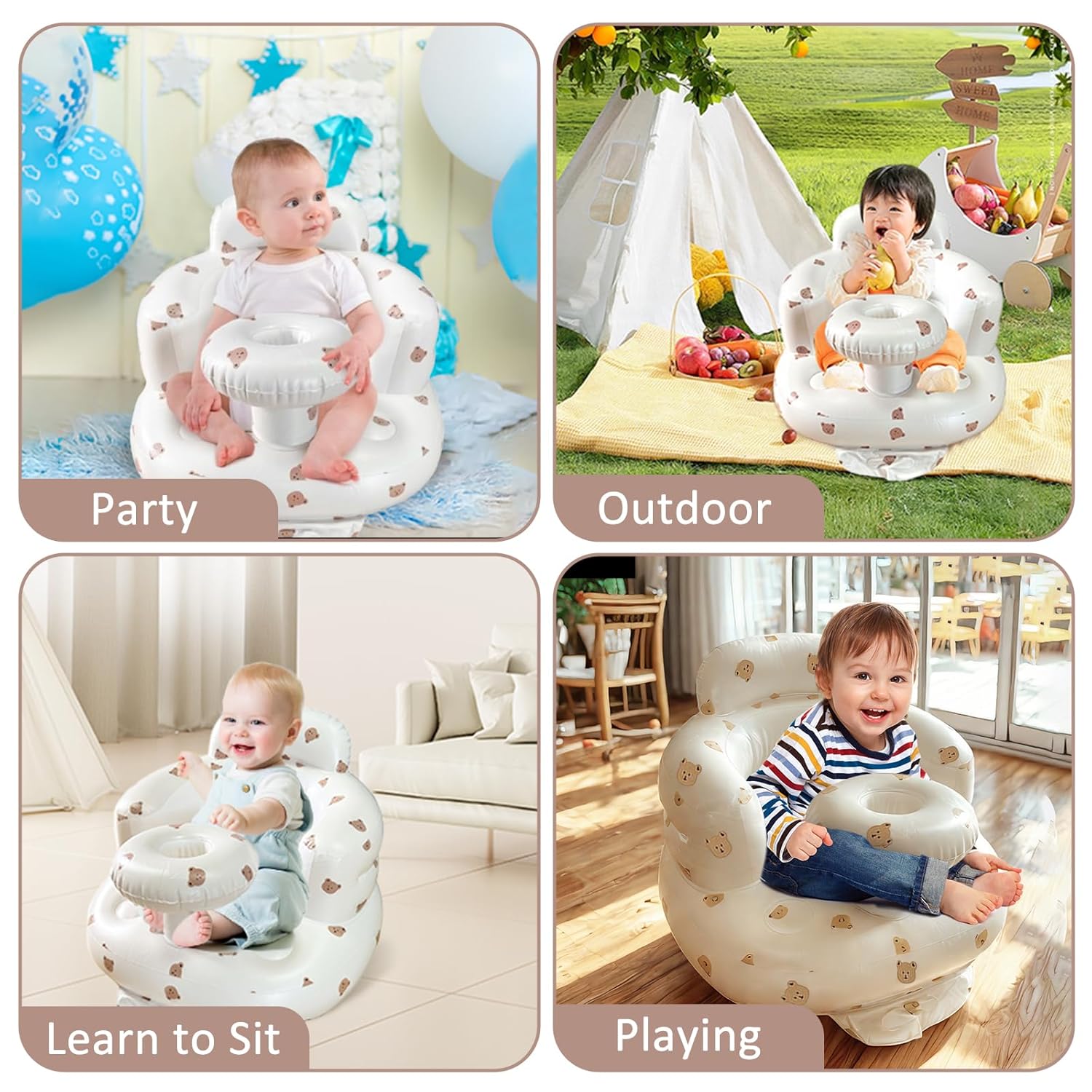 [Multi occasion application]: This baby inflatable seat can be used when babies are just starting to learn how to sit, and can also be used for feeding, at home, on the floor, in the pool, in the bathroom, camping, indoors and outdoors.