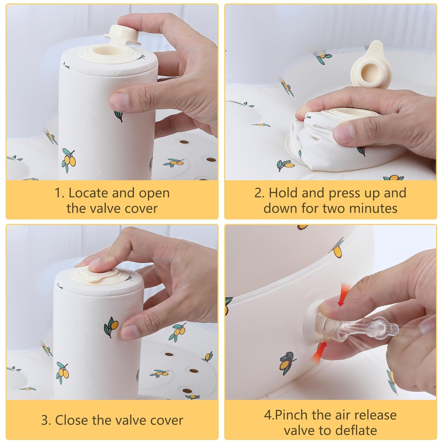 Easy to Use: Inflatable baby feeding chair can be easily inflated within 5 minutes by pressing the built in air pump up and down. Due to the leak-proof design, it is necessary to pinch the air valve when deflated. After deflates, folds and stores compactly, making it a great companion for travel, camping or outing