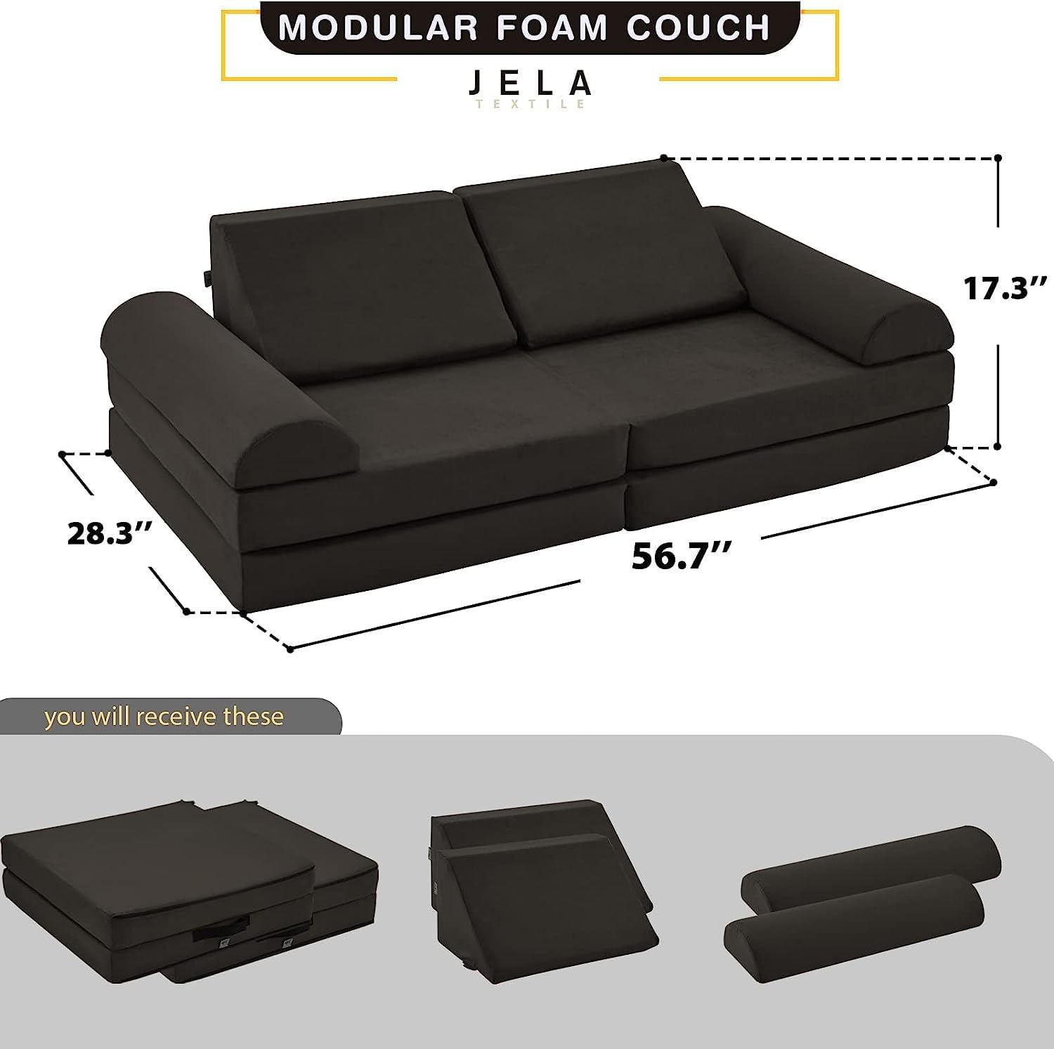 jela Kids Couch Large, Floor Sofa Modular Funiture for Kids Adults, Playhouse Play Set for Toddlers Babies, Modular Foam Play Couch Indoor Outdoor (57″x28″x18″, Charcoal)