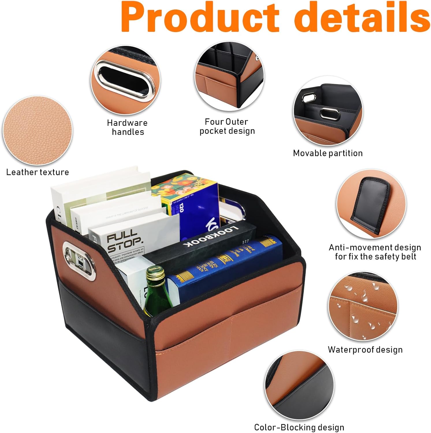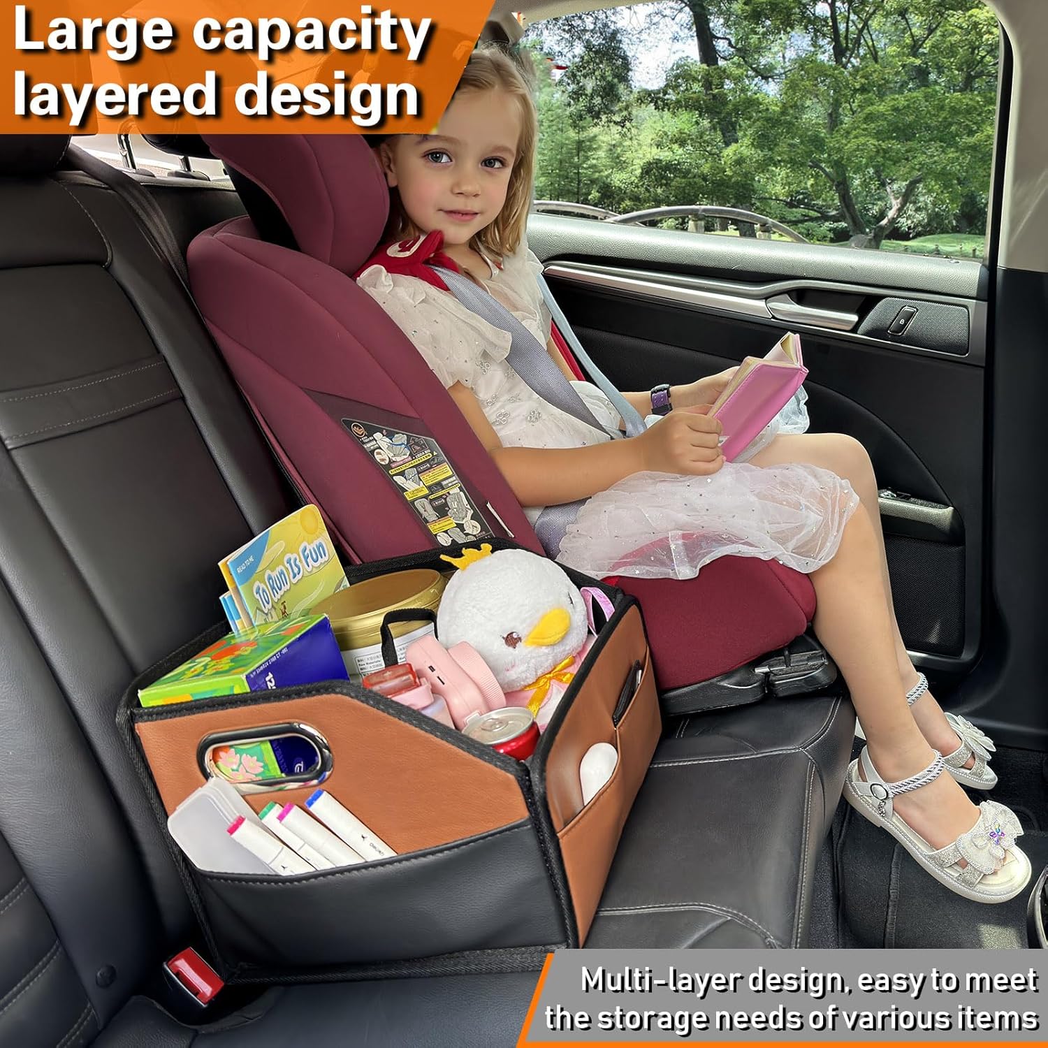Name Car Storage Organizer Material PU Leather Weight 2.2 lb Dimension 12.59”x11.4”x9.05” Color Black & Brown color blocking Usage Car passenger seat or backseat organizer for kids