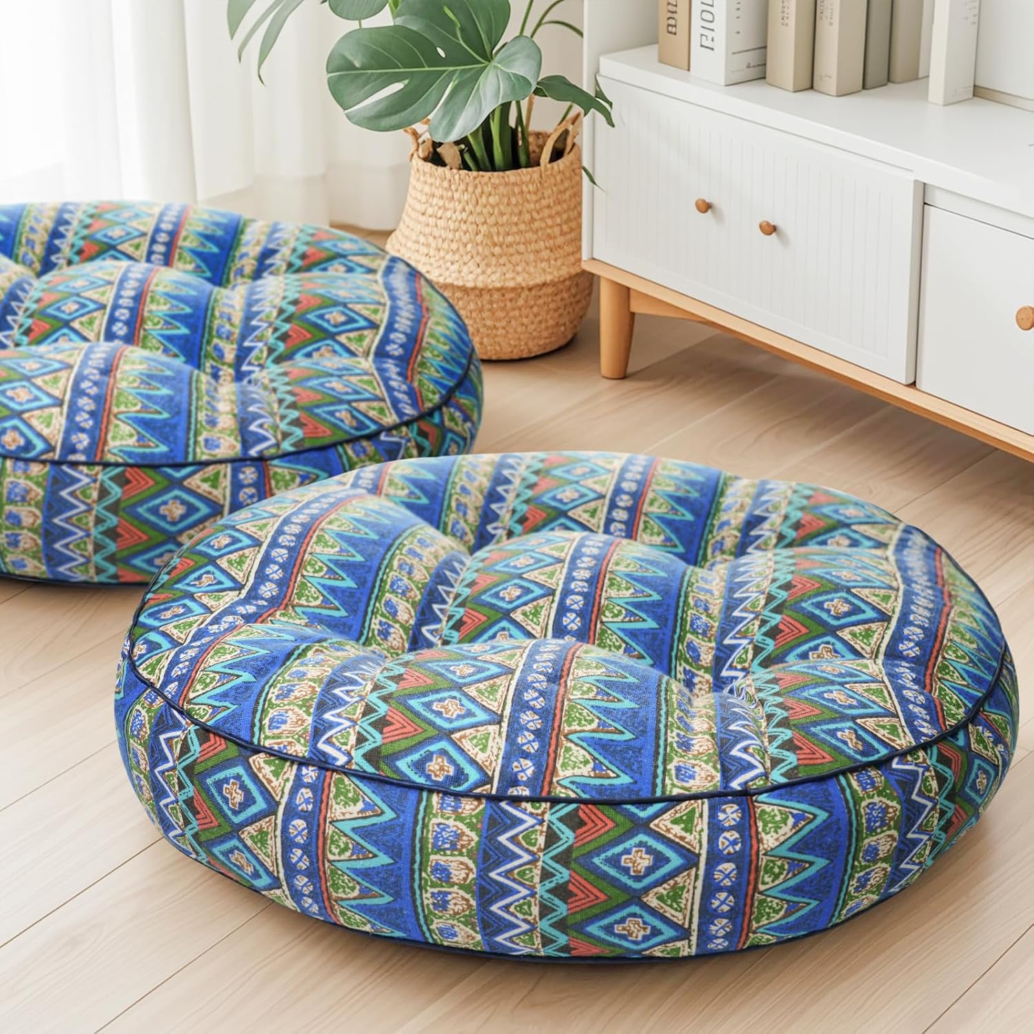 【Suitable Size】: Our round floor pillow sets of 2 meausures 22*22in, 3in thickness,this suitable size provide conveninent way for reading , watching TV, Yoga, relaxing. and our floor cushion is easy to move.