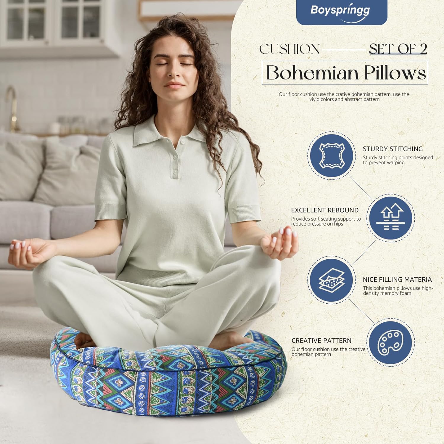 【Creative Pattern】: Our meditation cushions use the crative bohemian pattern, use the vivid colors and abstract pattern. The design make the cushions more attractive and beautiful, it can decorate your livingroom and playroom, window and other places you want. Family members can use these 2 sets floor cushions to watch TV and play games or books.
