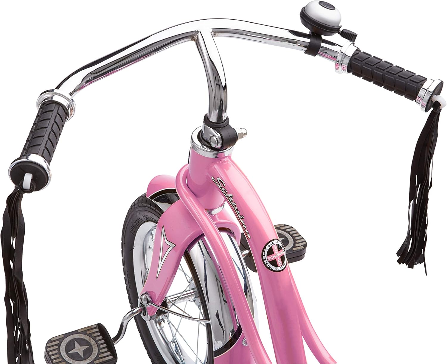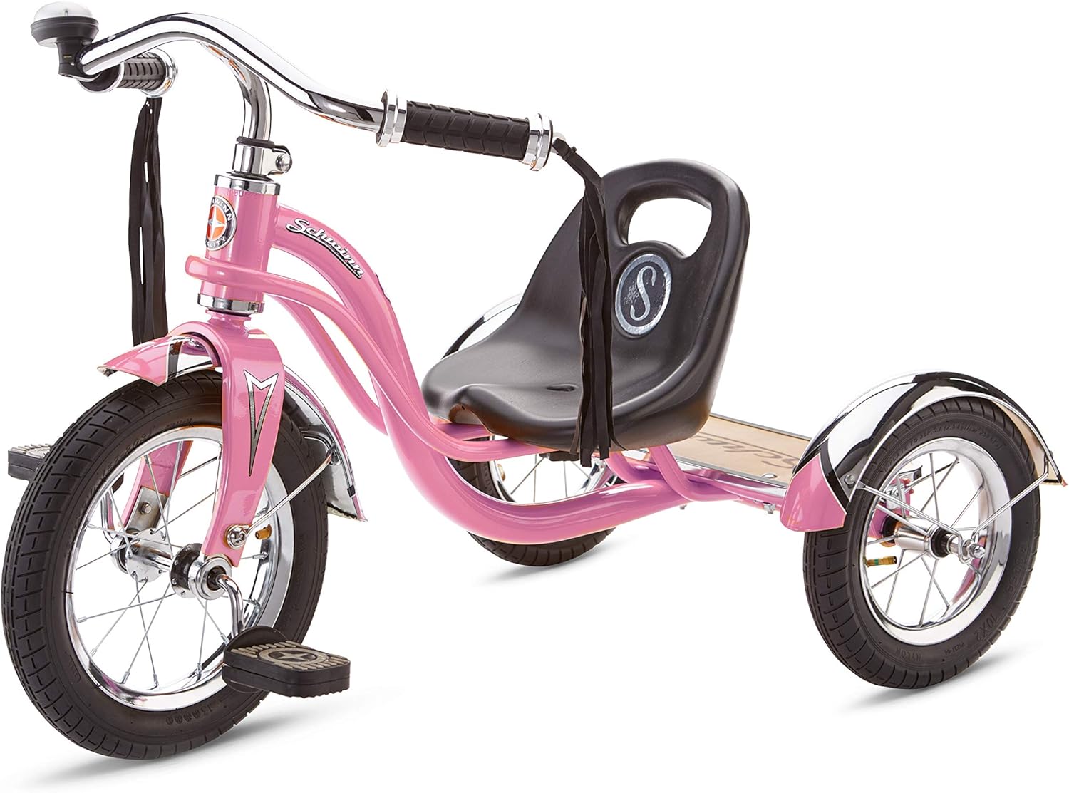 Schwinn Roadster Bike for Toddler, Kids Classic Tricycle, Low Positioned Steel Trike Frame w/ Bell & Handlebar Tassels, Rear Deck Made of Genuine Wood, for Boys and Girls Ages 2-4 Year Old, Light Pink
