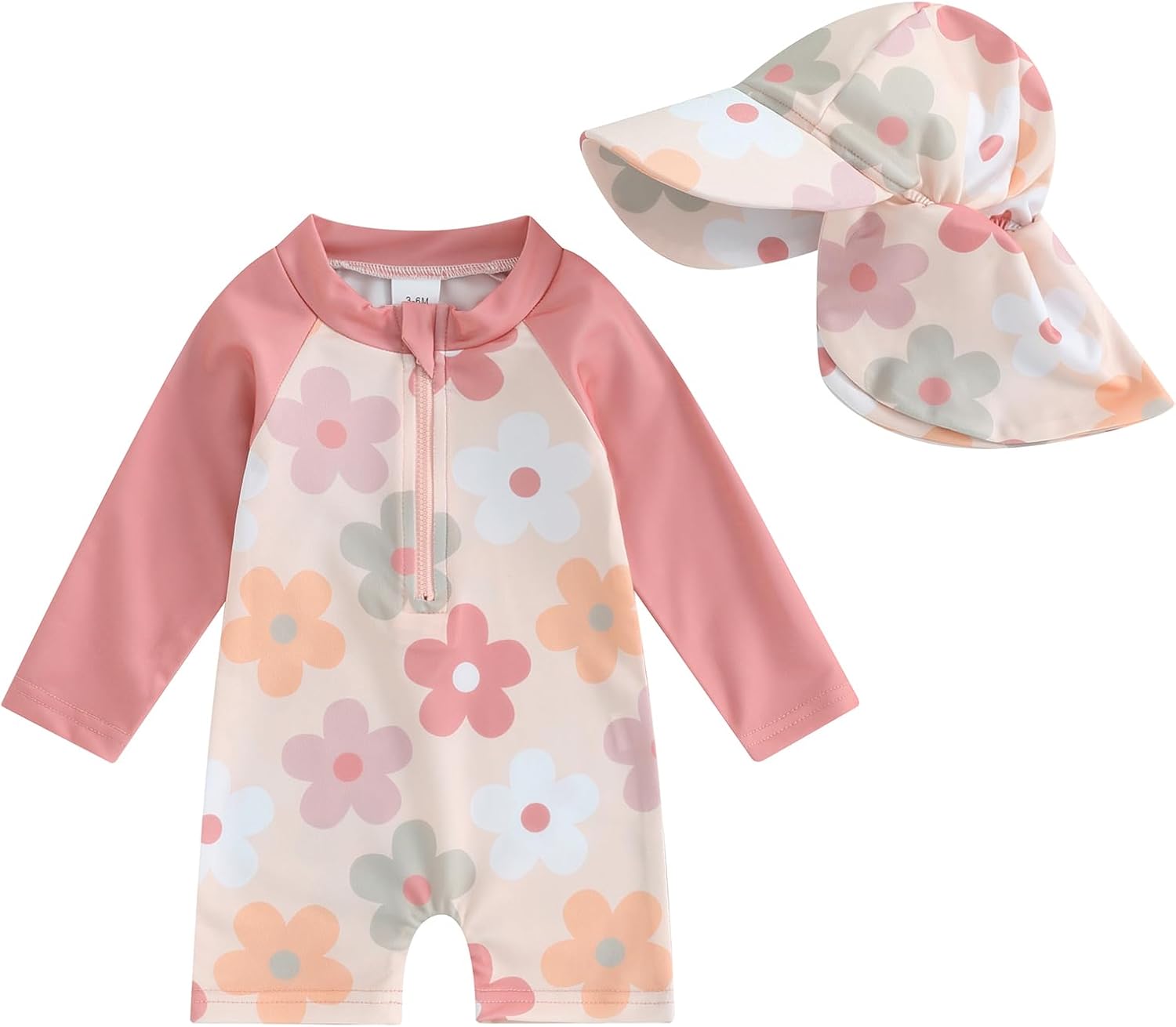 LYSINK Toddler Baby Girl Swimsuit Set One Piece Long Sleeve Zip Up Rash Guard Swimwear Sun Protection with Hat 2Pcs Bathing Suit