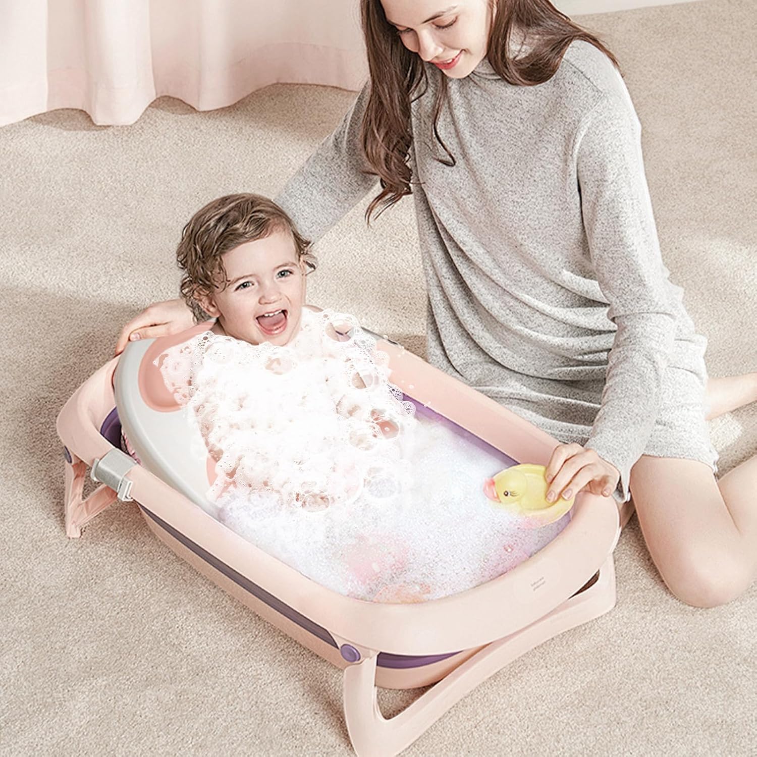Grismire Baby Bath tub Foldable, Baby Bath Essentials Baby Bath tub Newborn to Toddler Portable Collapsible Travel Multifunctional Baby Bath Tub with Anti-Slip Mat, Drain Hole, with Thermometer Pink