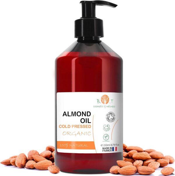 Almond Oil: Organic, Cold Pressed, Pure, Natural. Massage Oil (Carrier Oil) Hair Oil, Body Oil (Nail & Cuticle Oil) Face Oil (Anti Aging), Ear oil, Pregnancy Stretch Mark & Baby Oil – 250 ml