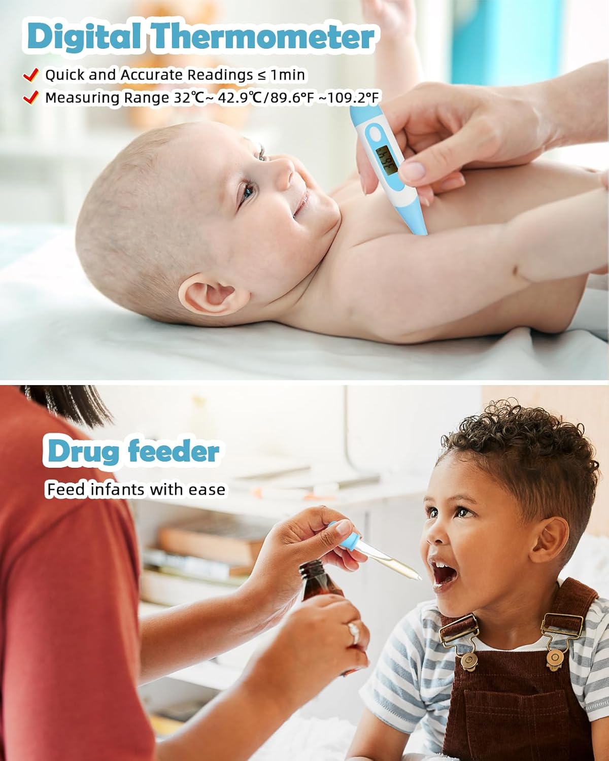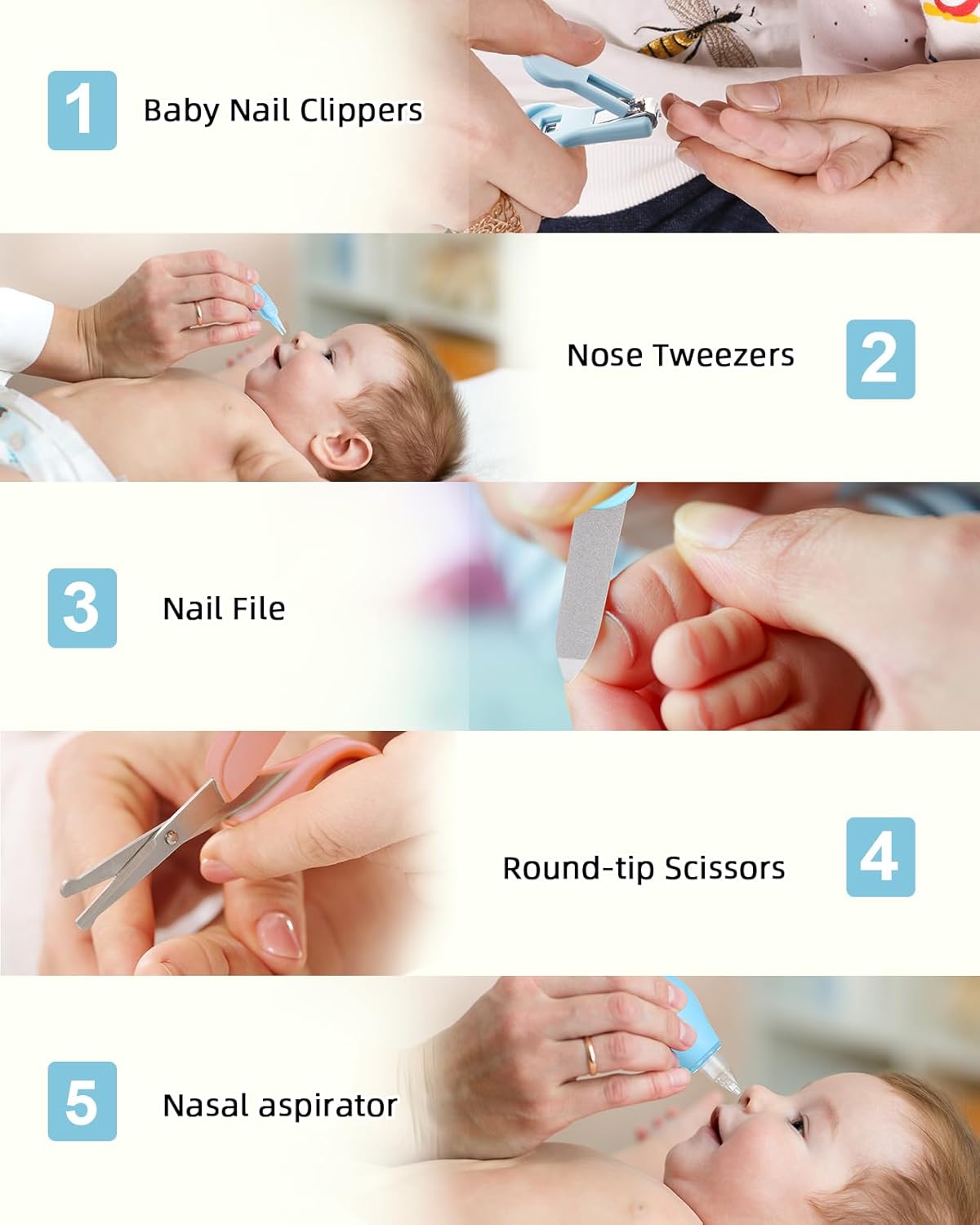 Multi-Baby Health Kits : Lictin baby grooming set includes a hairbrush, a hair comb, round-tip scissors, a bath brush, nose tweezers, a silicone finger toothbrush, a nasal aspirator, a protective case, nail clippers, a nail file, and a drug feeder, all housed in an exquisite storage case.