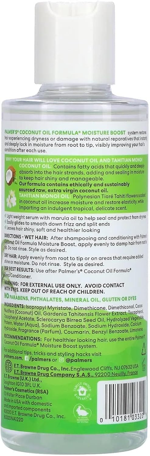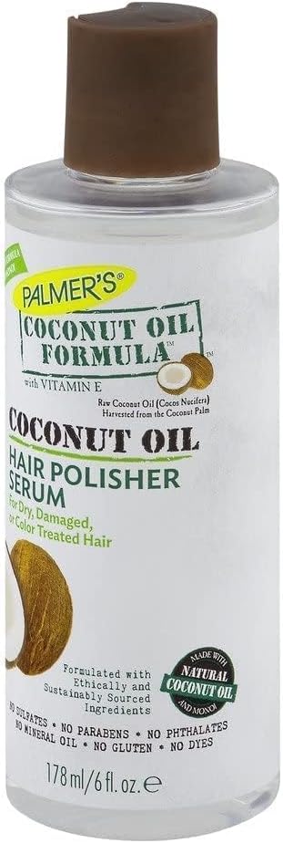 DESCRIPTION Raw and natural ingredients deeply moisturize, repair damage and give hair an incredible shine. Palmer Coconut Oil Coconut Oil Formula Hair Polish Serum is a shine-enhancing serum that instantly controls frizz, adds high-definition shine and makes hair feel like silk. Sulfate free? Paraben free? Phthalate free? No mineral oil? Gluten-Free, Color-Free Ingredients, Coconut Oil: Deeply moisturizes and adds shine. Monoï oil: moisturizes and softens Marula oil: tames frizz and adds shine.