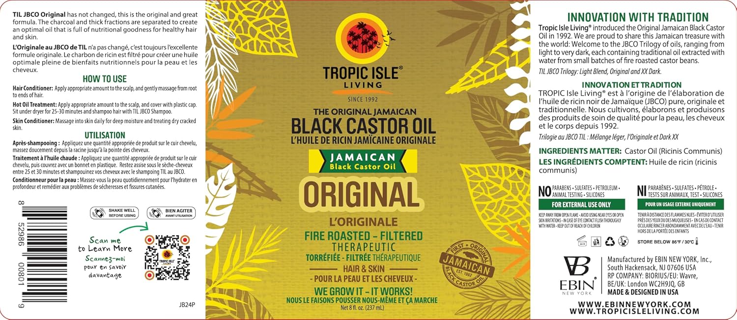 Tropic Isle Living Jamaican Black Castor Oil is your go-to solution for natural beauty and wellness. Made from 100% pure castor beans, this versatile oil deeply nourishes and strengthens hair, promoting healthy growth and thicker, fuller strands. Its hydrating properties make it an excellent skin moisturizer, helping to soften rough areas, fade scars, and enhance your complexion. Perfect for enhancing lashes and brows, this multipurpose oil is also ideal for hot oil treatments and massages. Experience the rejuvenating power of Jamaican Black Castor Oil in every drop and embrace natural care for hair, skin, and beyond!