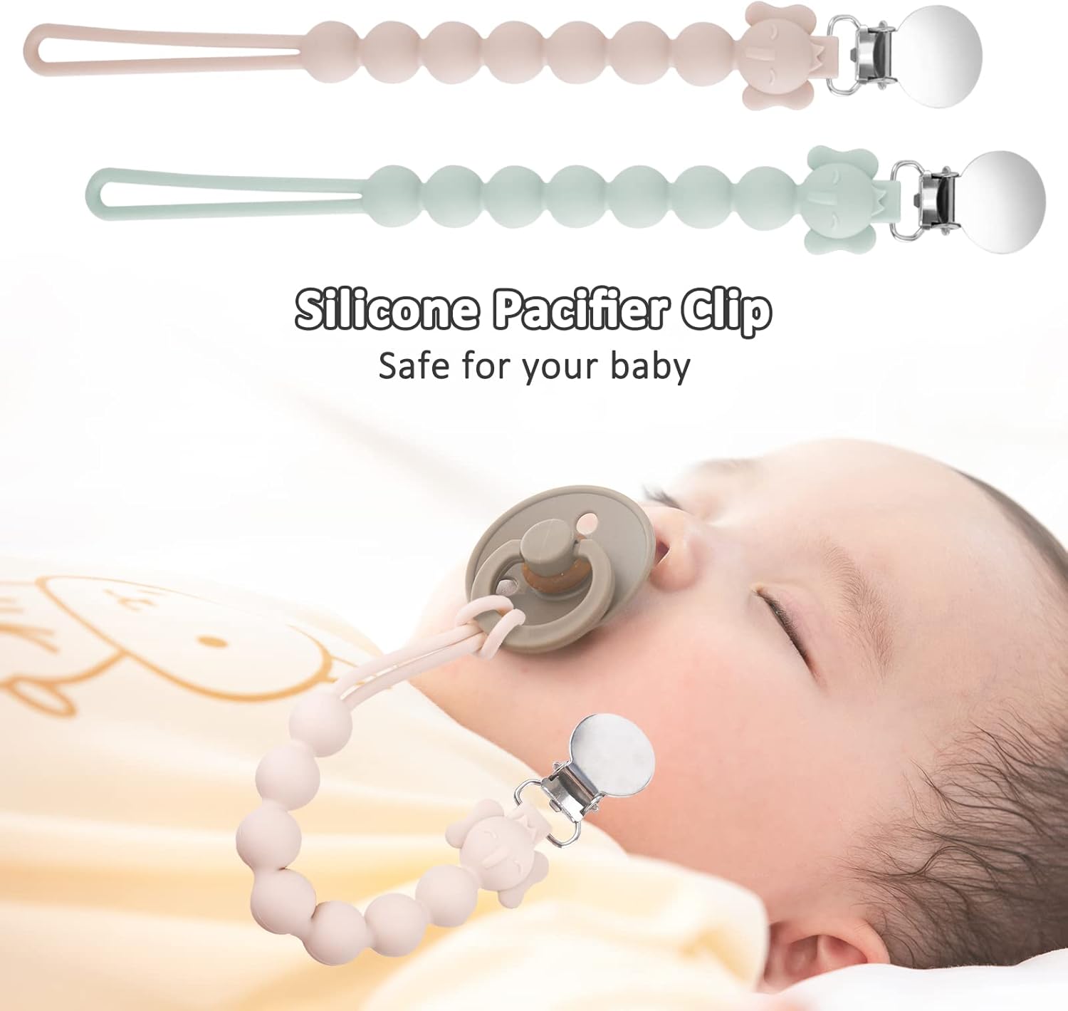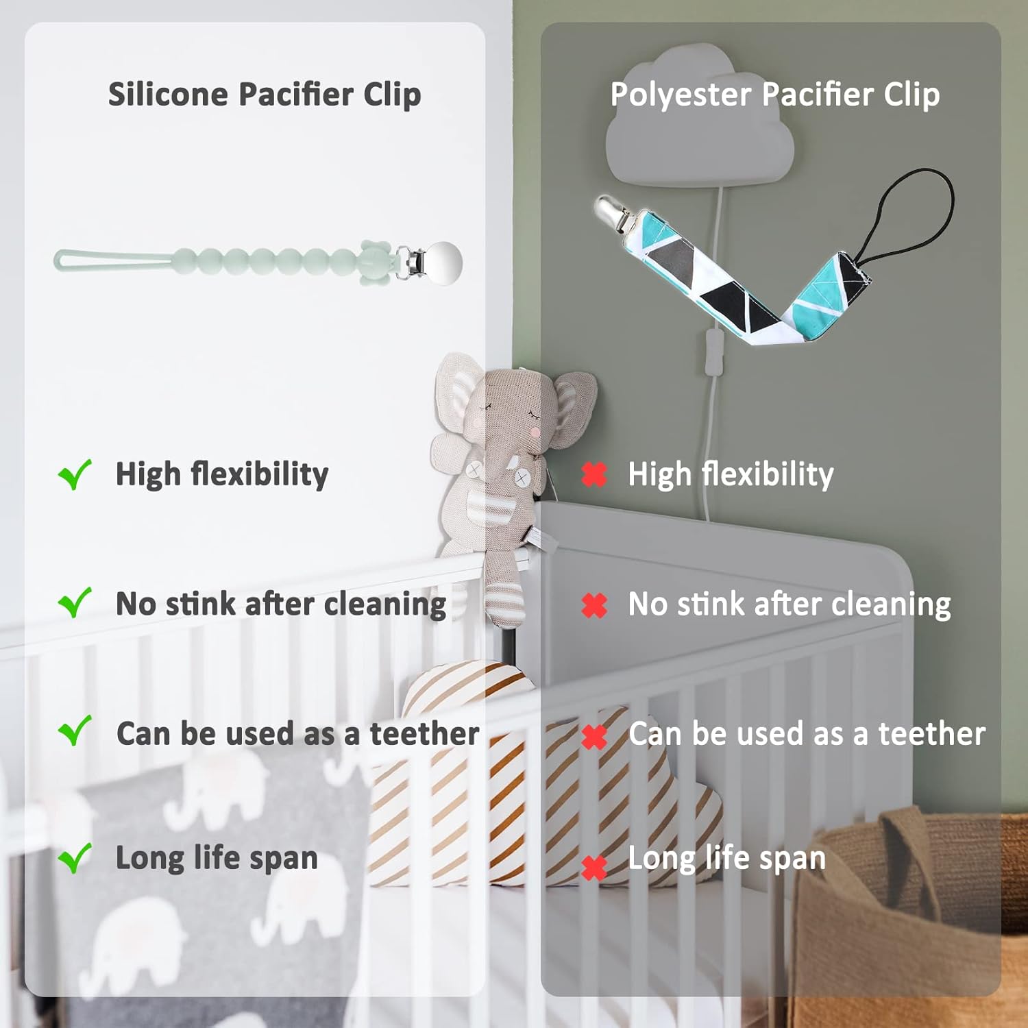 【Food Grade Silicone】The pacifier clips are made of high-quality food-grade silicone material, which is more flexible and easy to clean compared to cloth or ribbon-like material, and is not prone to breakage and odor after long use.