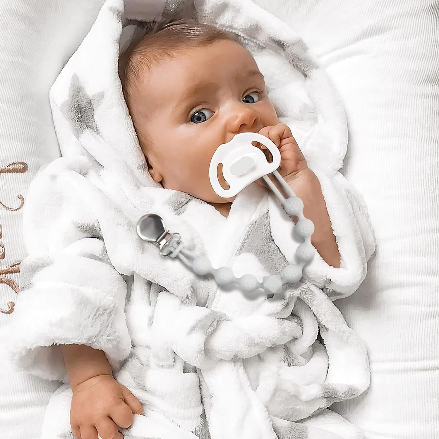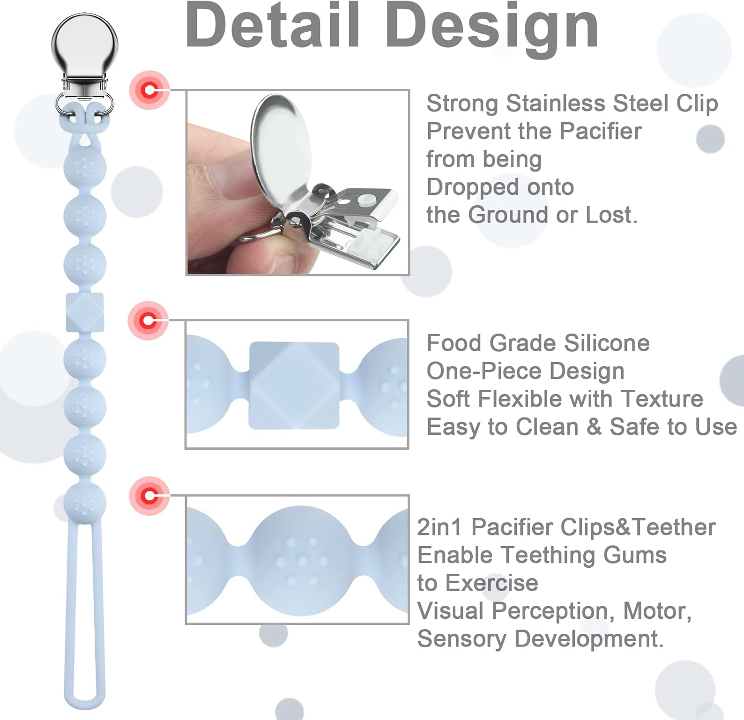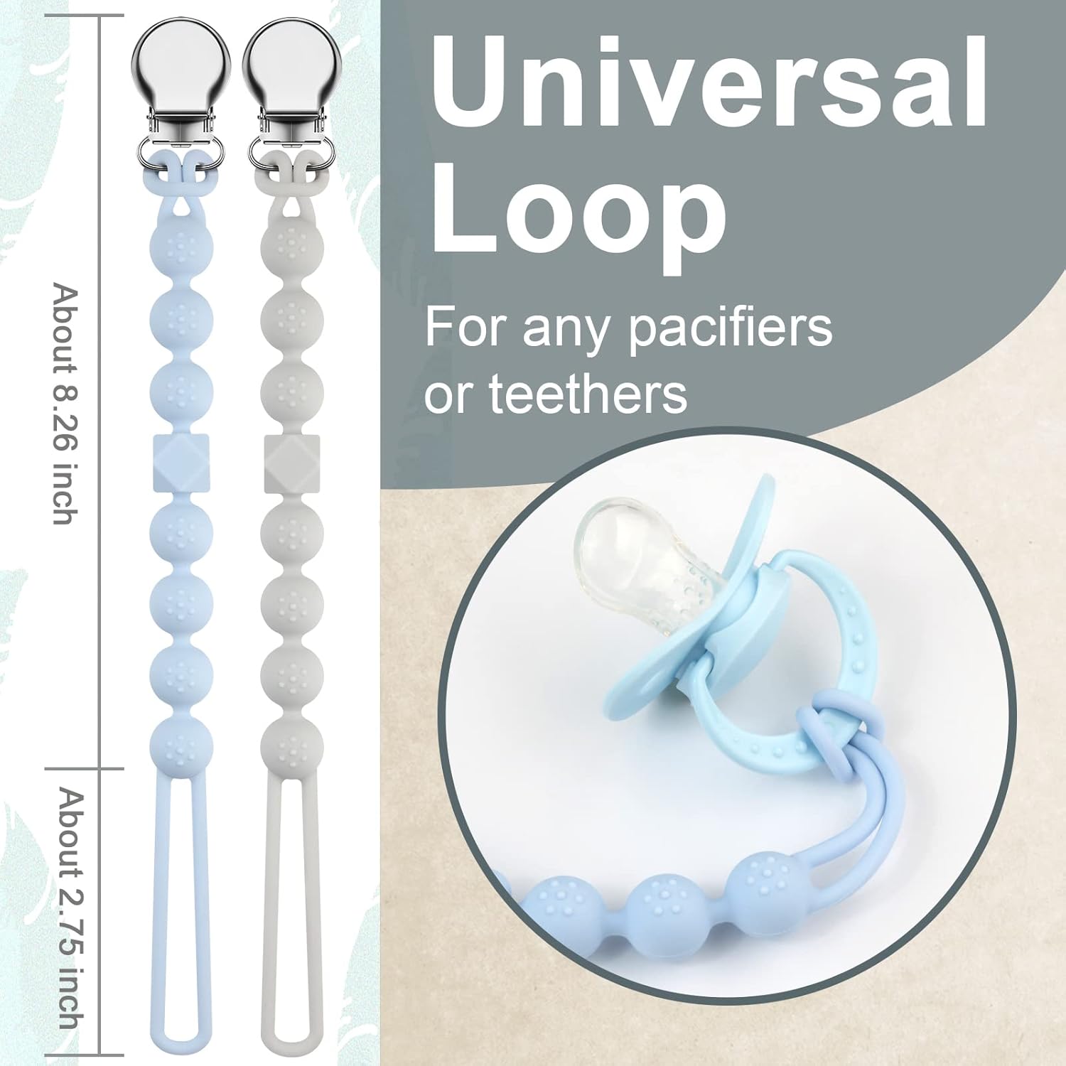 Silicone Dummy Clips Teething for Boys Girls are Made of Food Grade Material, Universal Fit all Brand Pacifiers, Adult Supervision is Recommended. Baby Shower Gifts. BPA Free.