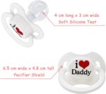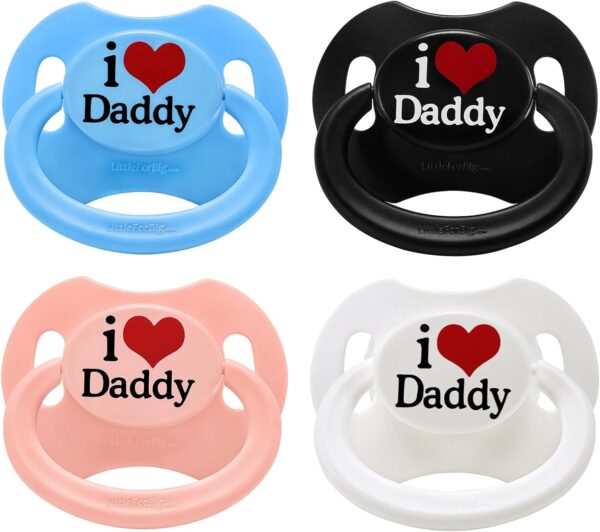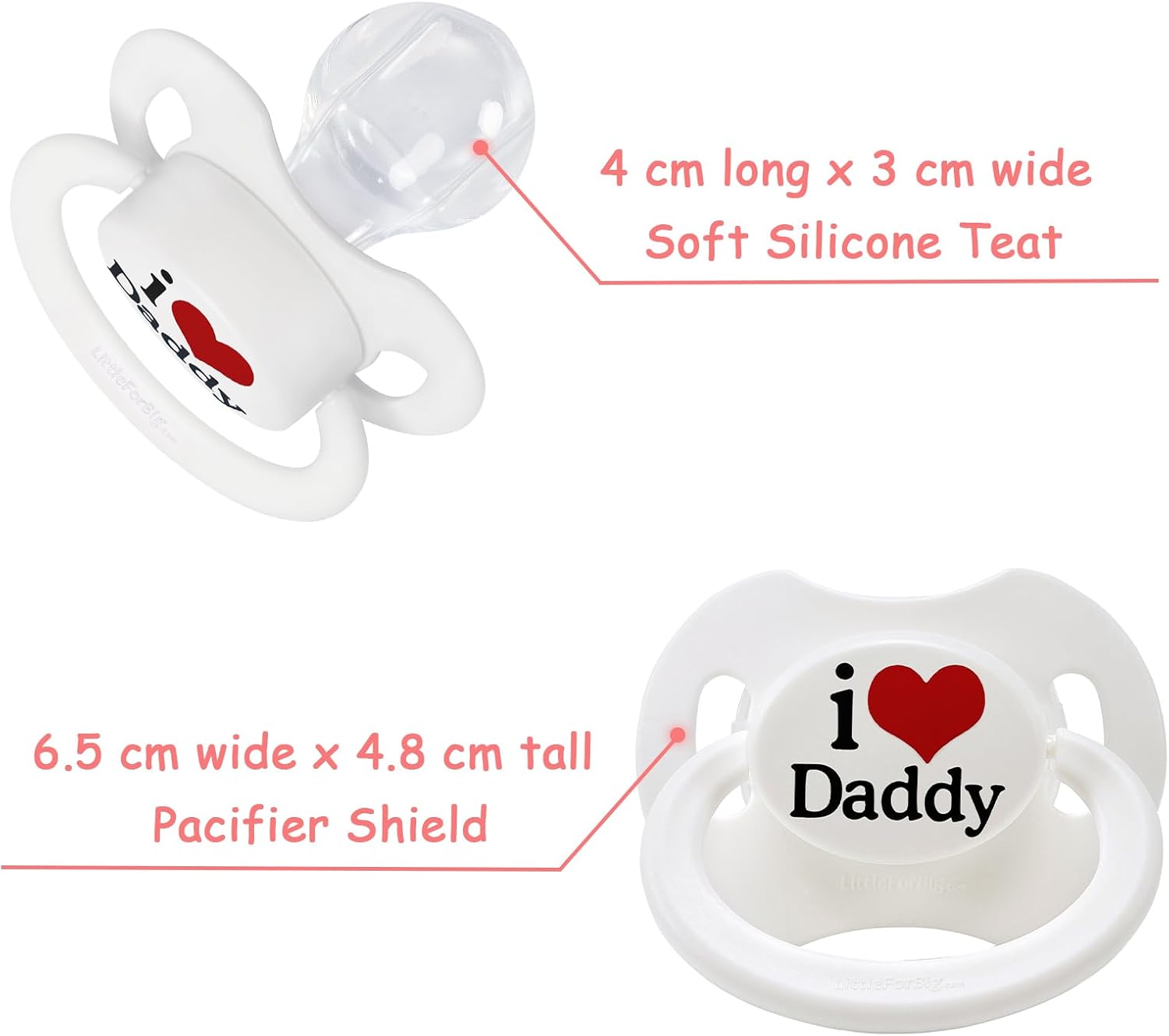 Adorable “I Love Daddy” Printed Pacifier Set: Experience the charm of our “I Love Daddy” patterned pacifiers, designed specifically for adult-sized pacifier enthusiasts. These pacifiers feature a delightful and endearing “I Love Daddy” print on the button, guaranteed to bring joy and comfort.