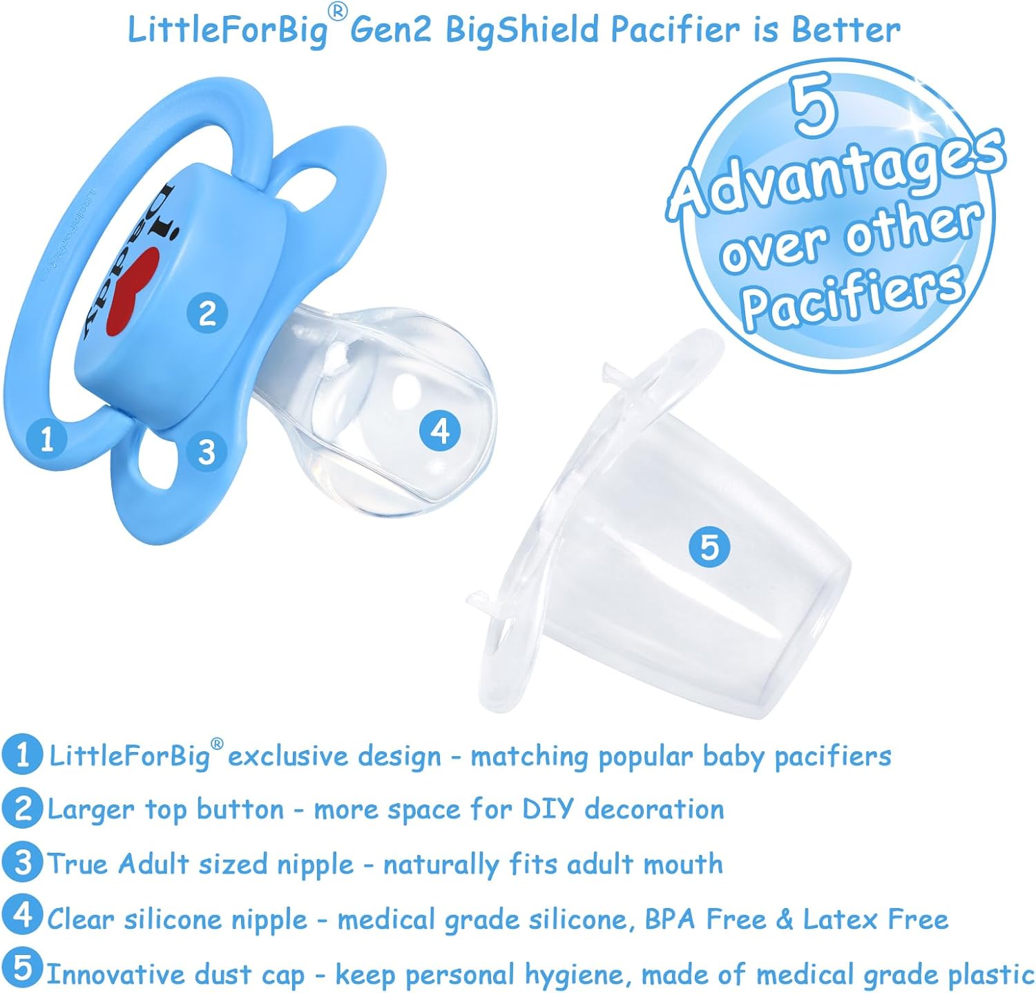 Enhanced Features by BigShield Pacifiers – We’ve incorporated several improvements, including a shape that perfectly mirrors popular baby pacifiers, a larger button for effortless DIY decoration, a clear silicone nipple, and an innovative dust cap for enhanced hygiene. Crafted from medical-grade plastic, our pacifiers offer top-notch quality and durability.
