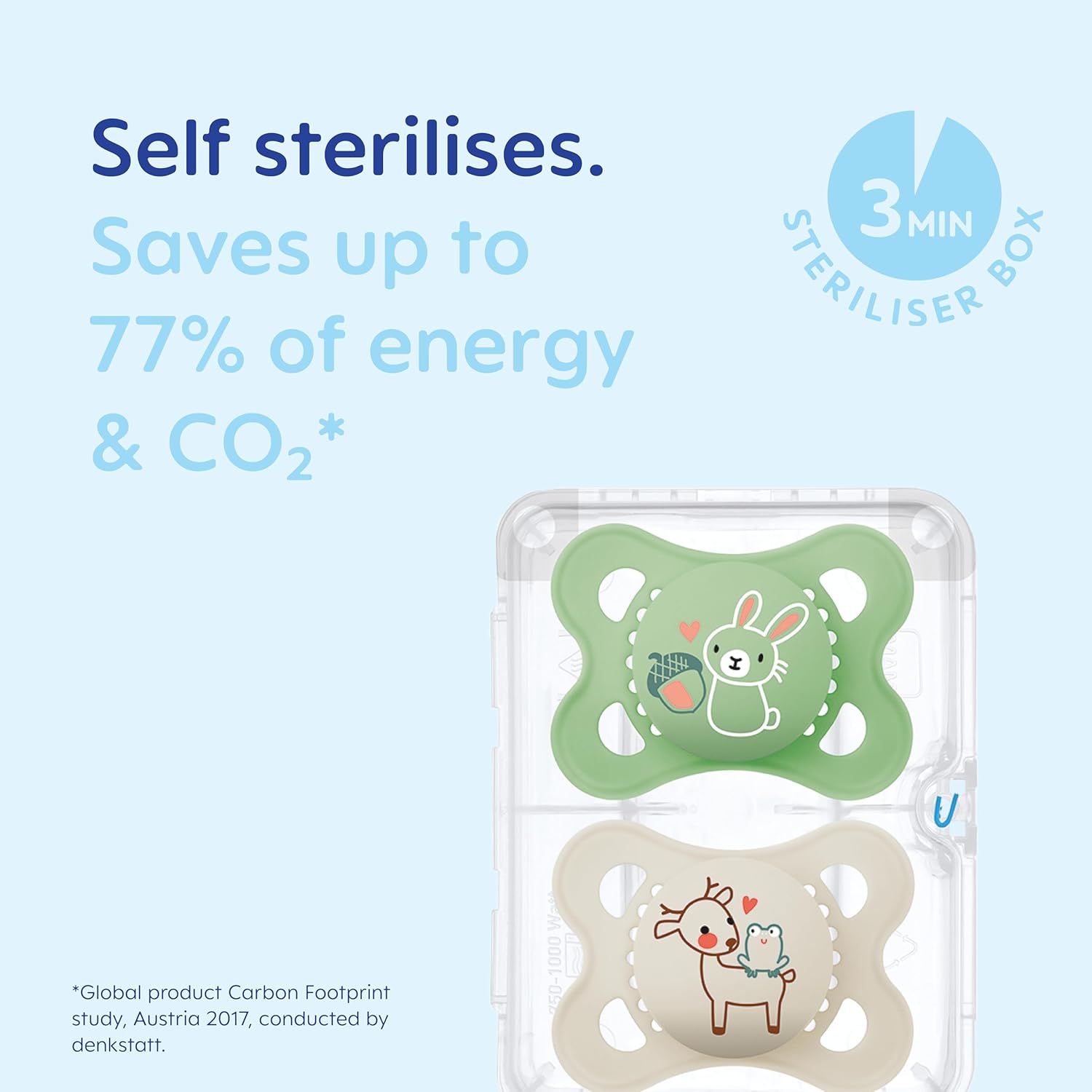 The MAM Original 2-6 months Soothers are ideal up to the age of 6 months as they offer a smaller teat and shield for younger babies. Packed in a convenient steriliser box they can be sterilised in 3 minutes in the microwave without the need for a separate steriliser.
