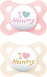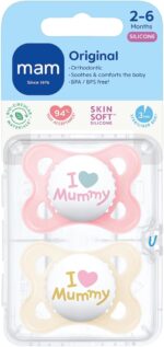 Product details: MAM Original Soothers (Pack of 2), 2-6 Months Baby Soothers, Self Sterilising Travel Case, Orthodontic soother colour: Pink, I Love Mummy (designs may vary) article number: SR3432G
