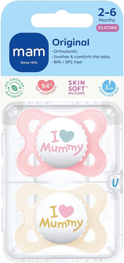MAM Original 2-6 Months (Pack of 2), Baby Soothers with Self Sterilising Travel Case, Newborn Essentials, Pink, I Love Mummy (Designs May Vary)