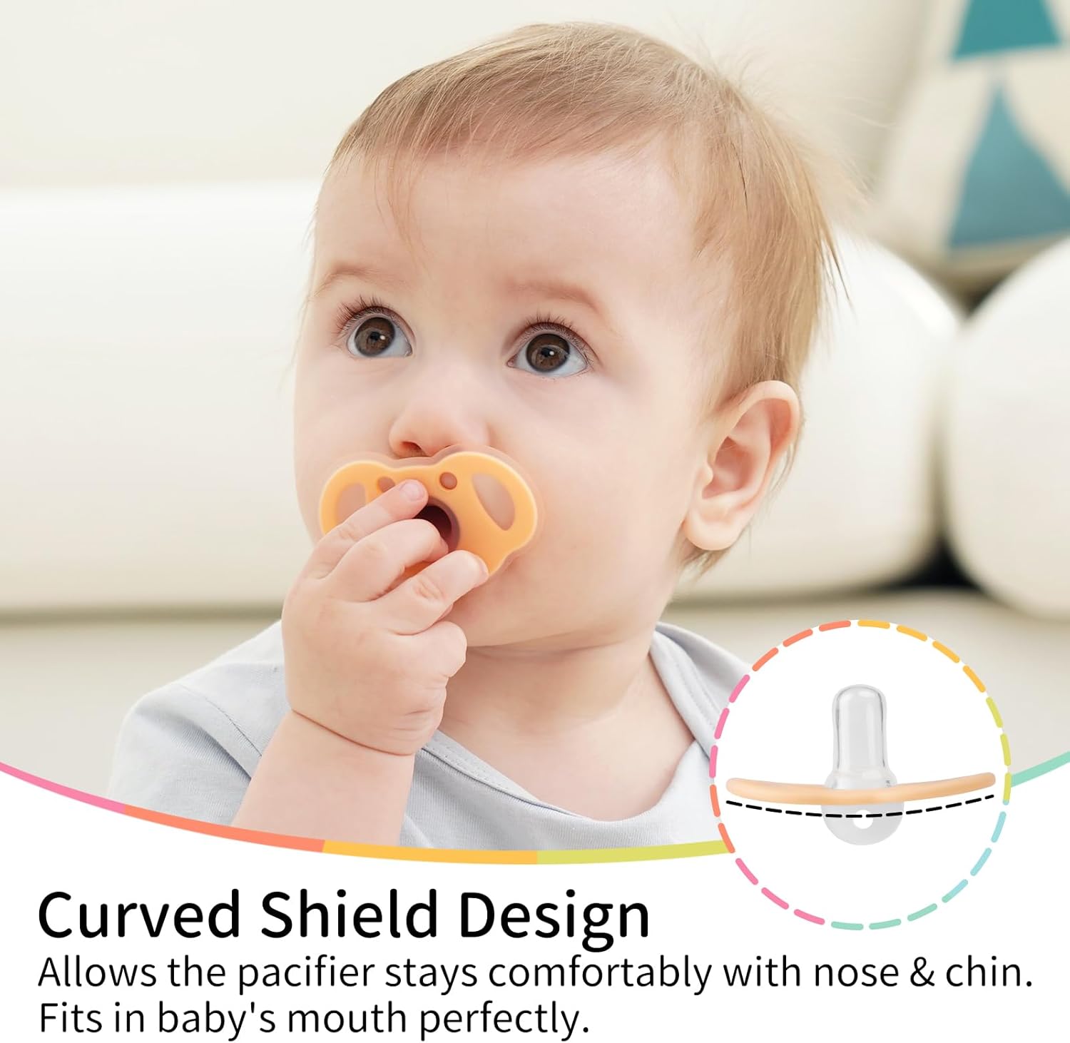 CURVED SHIELD DESIGN. Allows the pacifier stays comfortably with nose & chin and won’t drop. Fits in baby’s mouth perfectly.