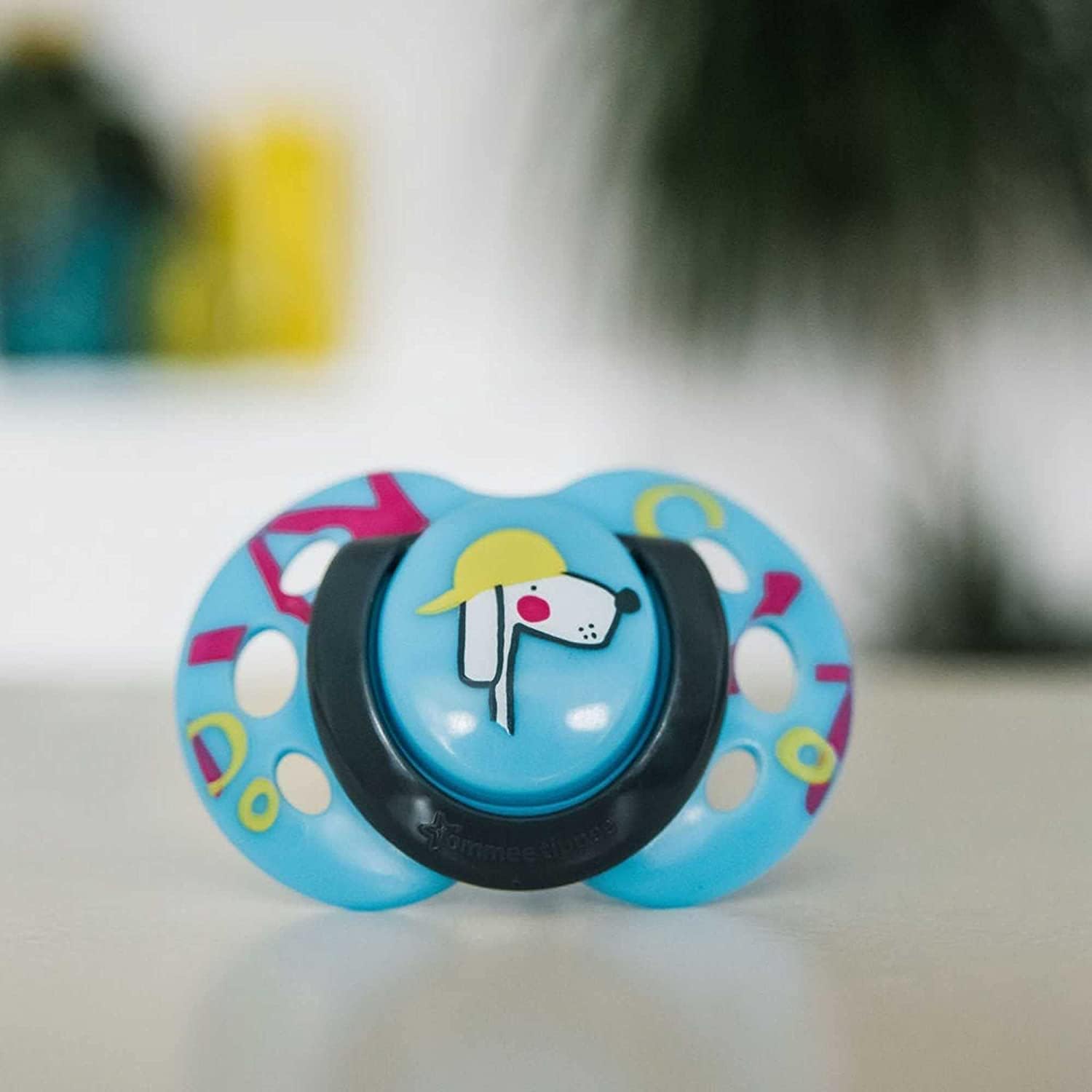 The instinctive action of sucking helps to calm and soothe babies and all parents know there’s nothing more wonderful than a calm, content baby. So, when you need to turn screams and sobs into smiles and sleep, simply pick up a Tommee Tippee Fun Style soother. Soothers are known by many different names such as dummies, pacifiers, dodies and binkies. At Tommee Tippee we use the word ‘soother’ as it does just that, soothes baby. Our orthodontic* Fun Style soothers feature an oval, reverse ortho baglet that is vented meaning it compresses more easily than traditional, air-filled baglets and therefore reduces pressure on baby’s developing teeth and gums. The symmetrical, soft silicone baglet that is fully reversible and has no ‘wrong’ side-up so the soother will always be placed correctly in your baby’s mouth, even when baby puts the soother in their mouth themselves. The curved shield sits comfortably between baby’s chin and nose and the holes in each side allow extra air flow and prevent the build-up of moisture which helps to protect baby’s delicate skin against irritation. The BPA-free silicone baglet is soft and flexible whilst also being robust and durable. The smooth surface of silicone is very easy to clean and won’t absorb stains and odours. Simply pop in a steriliser, wash by hand or in the dishwasher. We recommend that you replace the soother every month and always at the first signs of damage or weakness and we recommend stopping soother use when your child is older than 36 months. Our 6-packs of Fun Style soothers are packaged in 100% recyclable cardboard, and we have removed any single-use plastic from the packaging. *as compared to traditional round unvented soothers/pacifiers which do not compress as easily. **From an independent study in July 2021 of 416 mums with a 0-36m child, who are currently using a Tommee Tippee® soother: **99% of mums would recommend a Tommee Tippee soother **97% of mums say a Tommee Tippee soother helped settle baby **93% of mums say babies love their Tommee Tippee soother **98% accept a Tommee Tippee soother