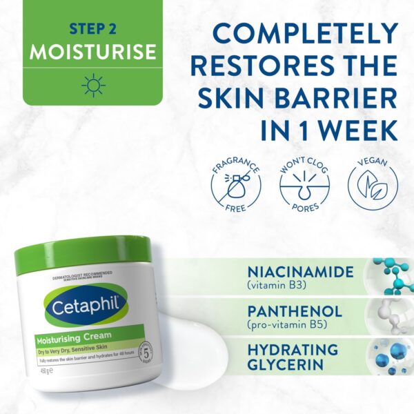 CETAPHIL MOISTURISING CREAM: A replenishing and hydrating moisturiser clinically proven to nourIsh and hydrate skin in just one day and help to repair the skin’s natural moisture barrier in just 1 week. Suitable for Face & Body.