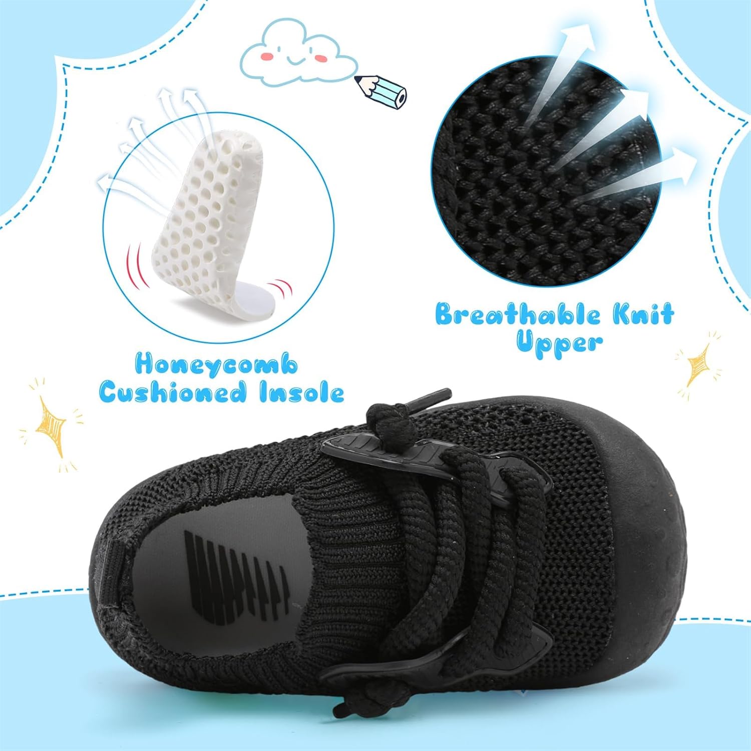 The superfine knit upper of these toddler shoes is breathable and dries quickly. Kids’ feet are kept dry and comfortable, even during exercise.