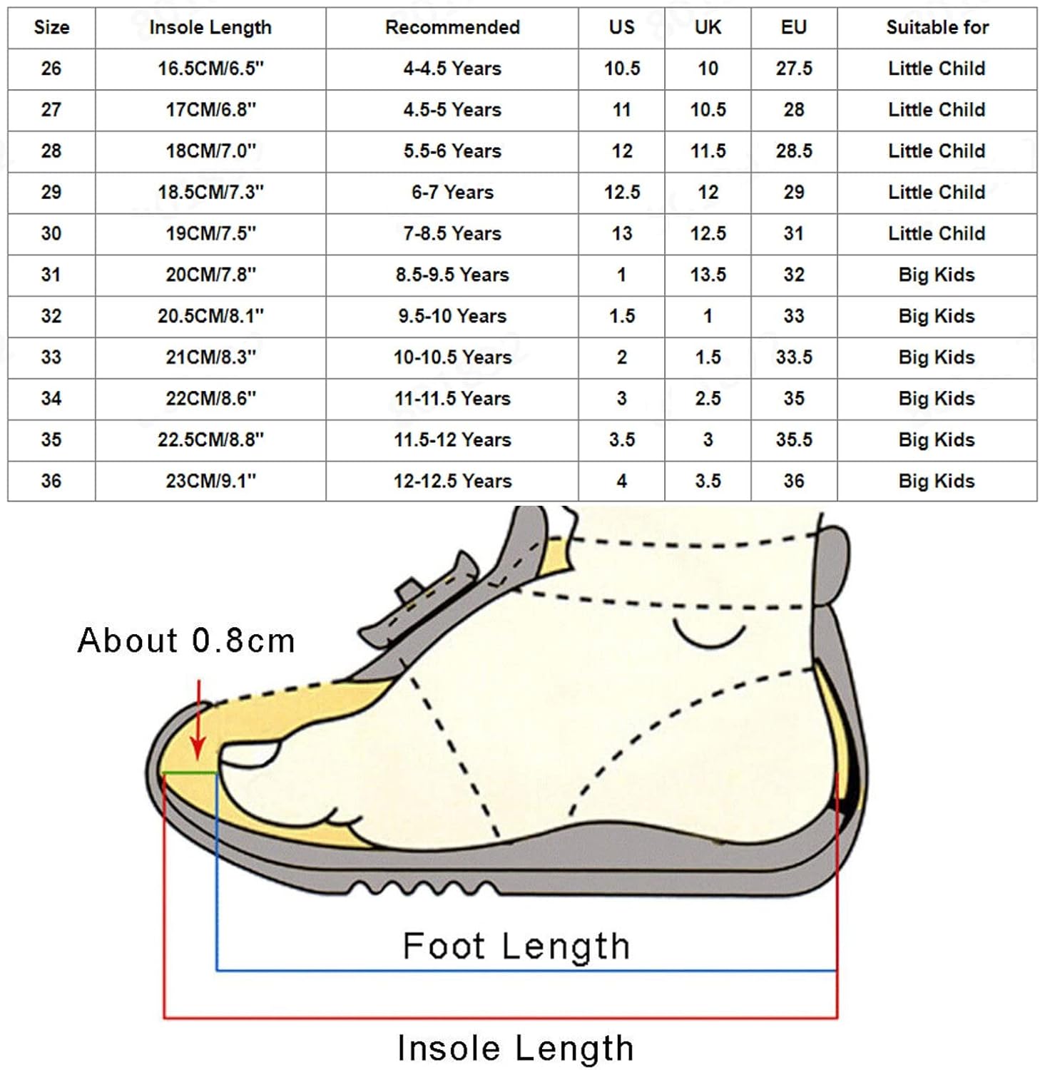 Note:Insole Length=Foot Length+0.8cm