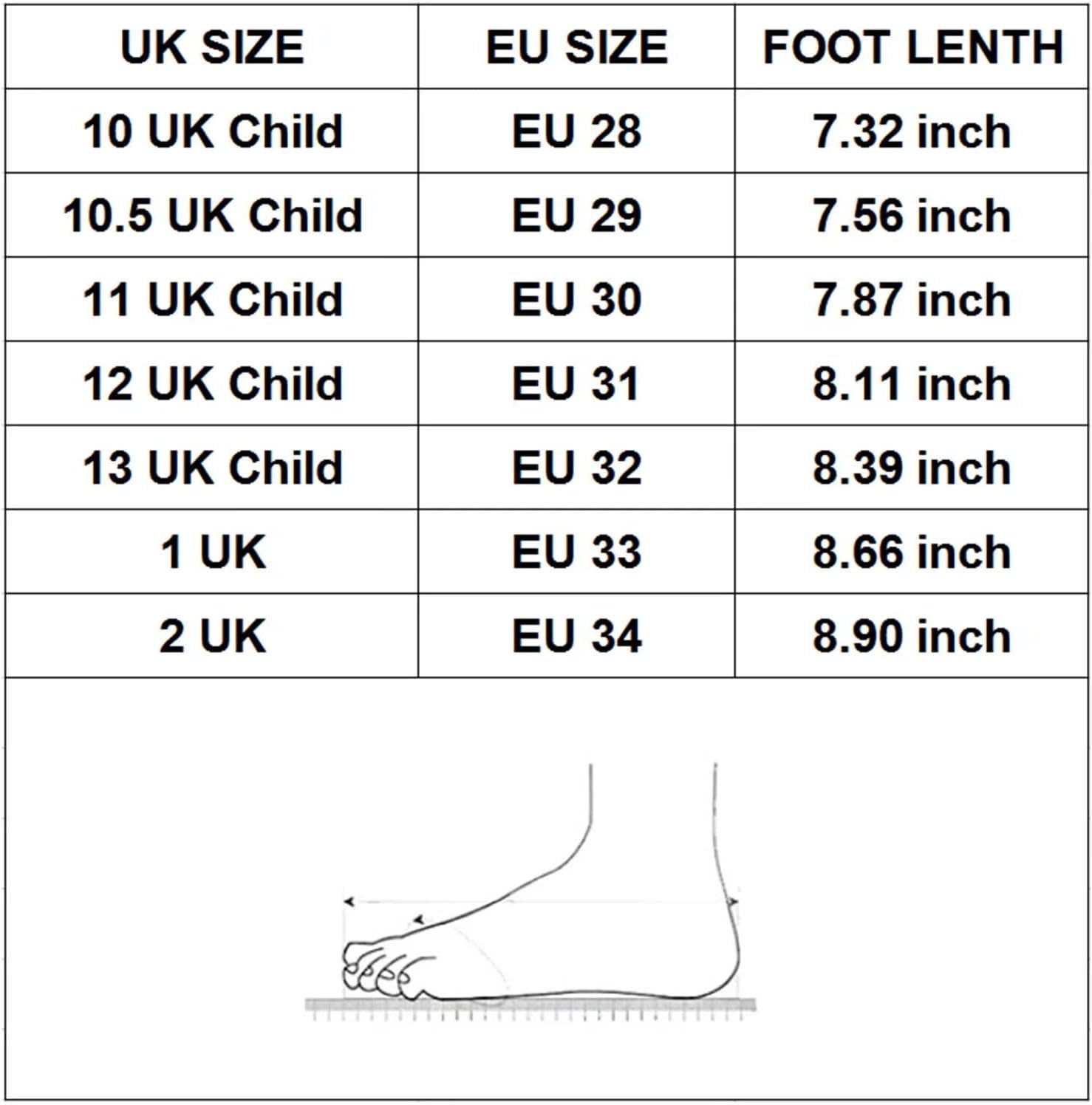 Size:Please review our shoe size chart and measure your child’s foot length before purchasing.