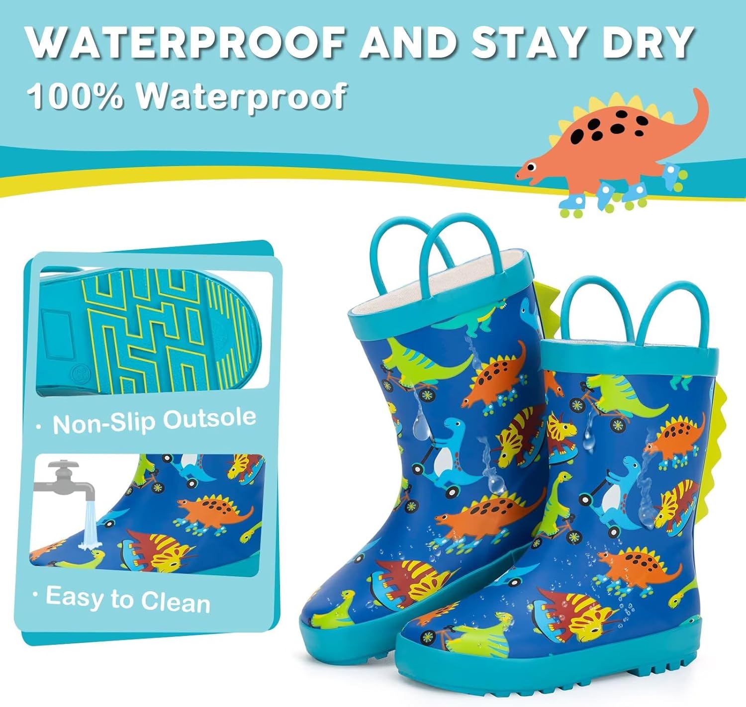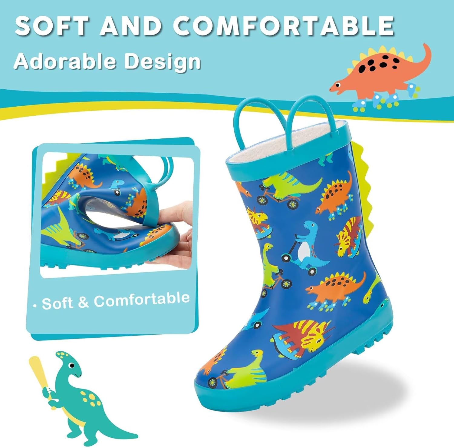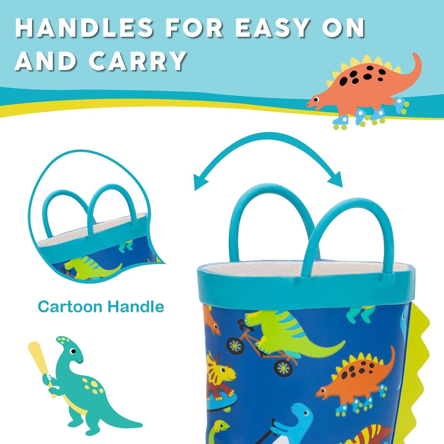 FUNCOO PLUS Toddler Wellies Kids Rubber Wellington Boots Waterproof Rain Boots for Boys and Girls with Handles in Fun Pattern