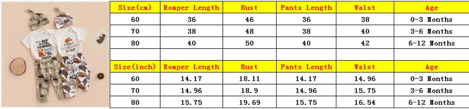 60 Romper Length: 14.17 Bust: 18.11 Pant Length: 14.17 Advised Age: 0-3 Months