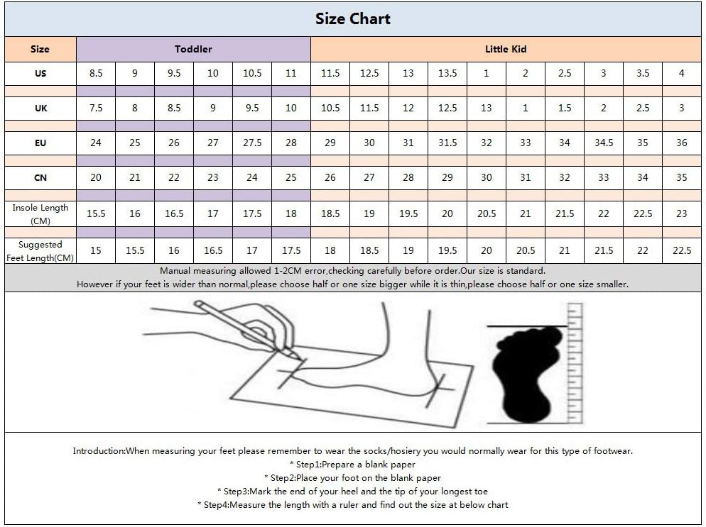 There is also a size chart displayed in the image include the size of US/UK/EU/CN, you can choose sizes which suitable for your kid’s foot.