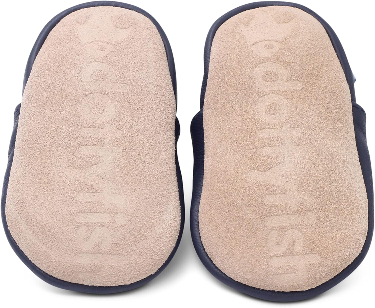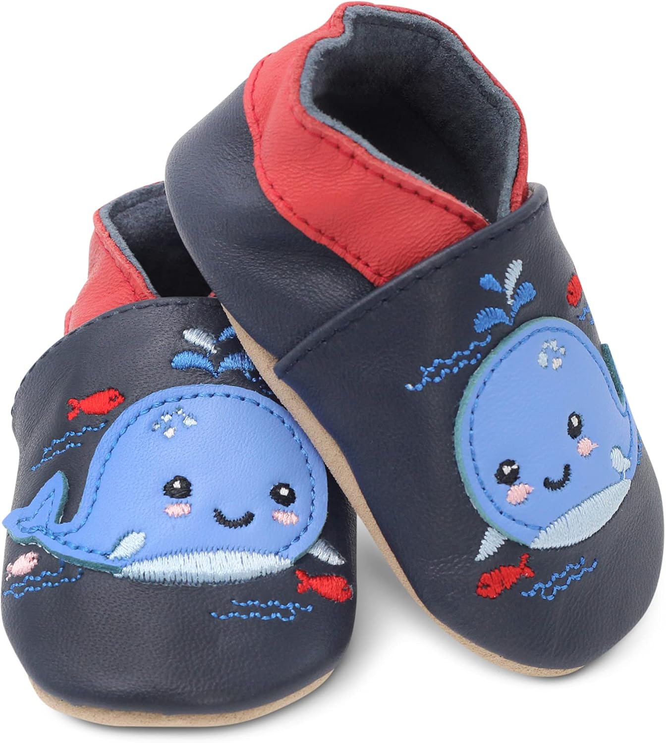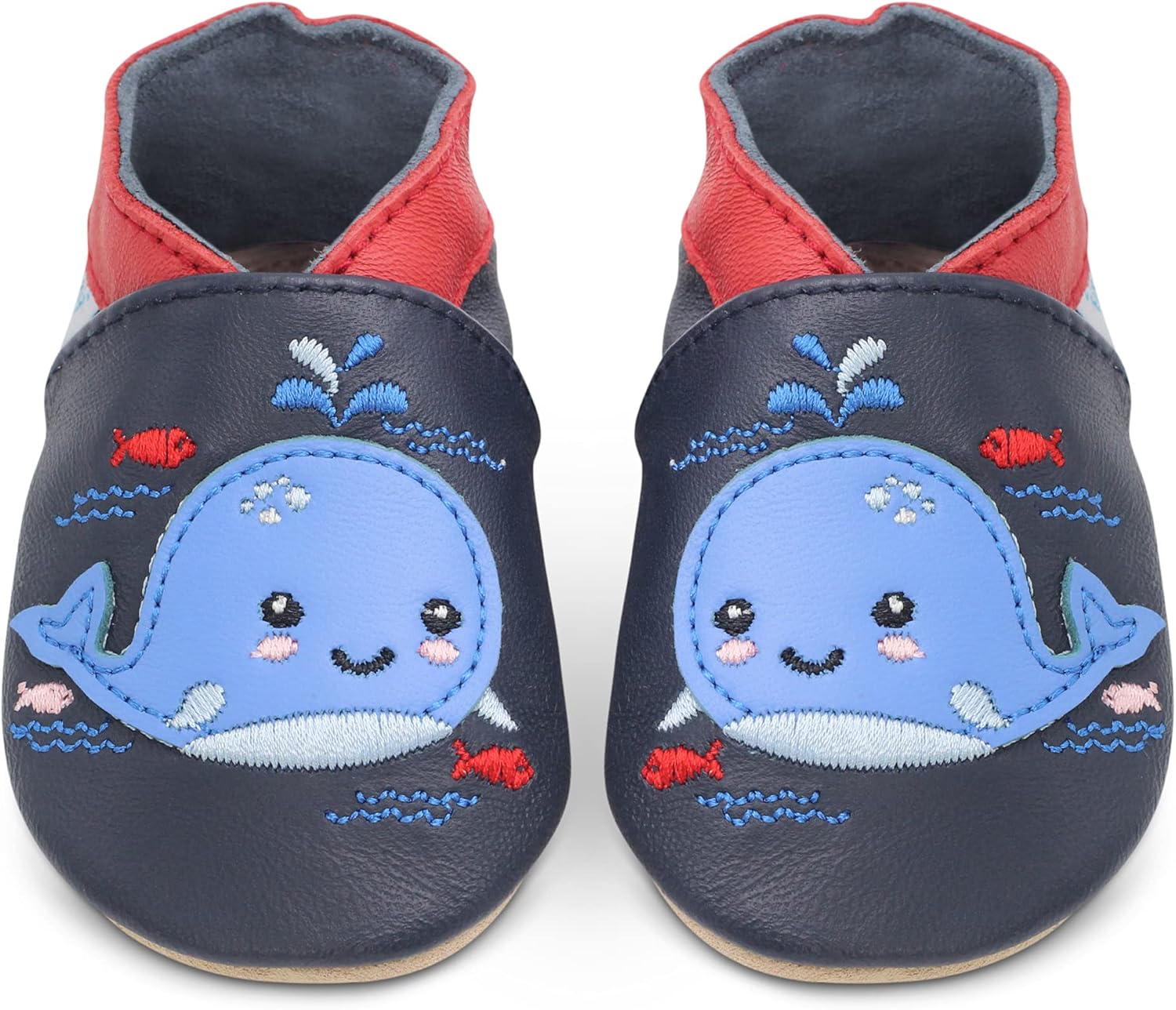 Dotty Fish Soft Leather Baby and Toddler Barefoot Shoes for Boys and Girls. Non-Slip Suede Soles. Animal Designs. 0-6 Months – 4-5 Years