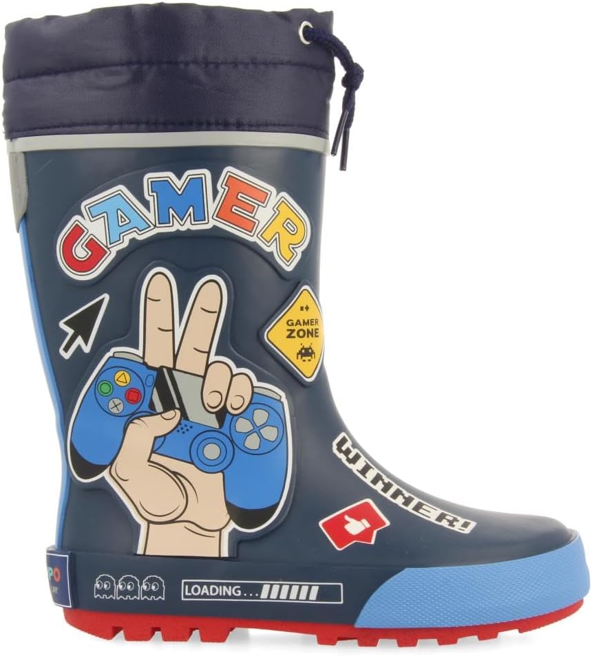 Ready for rainy days! Navy wellies with gamer patches. They incorporate adjustable nylon collar and 100% polyester padded lining and insole. The sole is made of natural rubber and is durable, waterproof and non-slip. He’ll wish it rain!