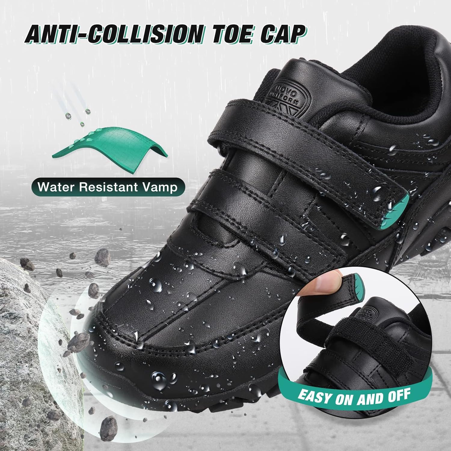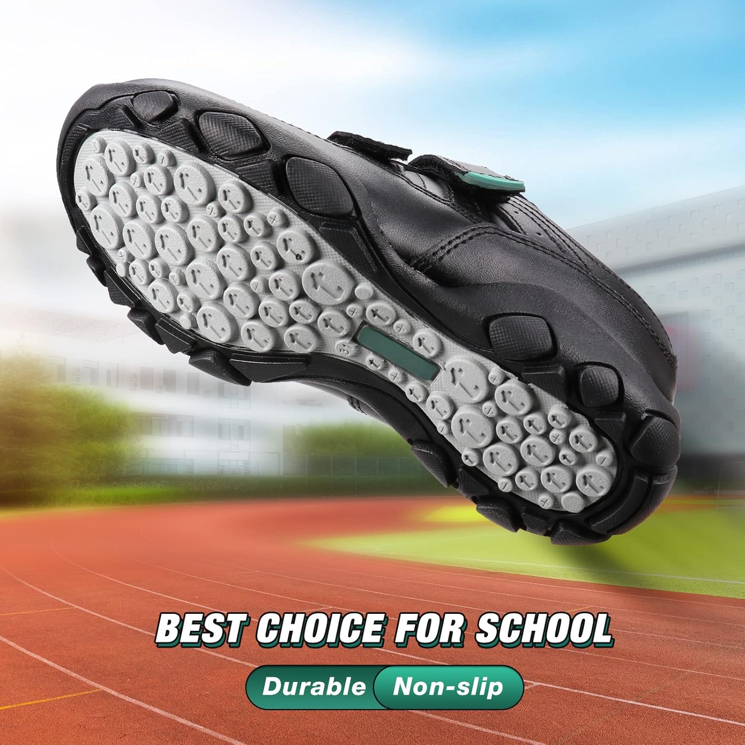 Features a breathable and water resistant upper which provides the ventilation your boys need and keeps feet dry all day. Skin-friendly /soft lining and cushioned foam insole ensures long lasting comfort.To make sure each step is steady, the super-durable outsole featuring lightweight and flexibility provides plenty of traction grip to keep your kids sure-footed.For easy on and off, Adjustable hook & loop closure will enable your boys to easily slide there feet in and out of these boys black trainers/boys school shoes.